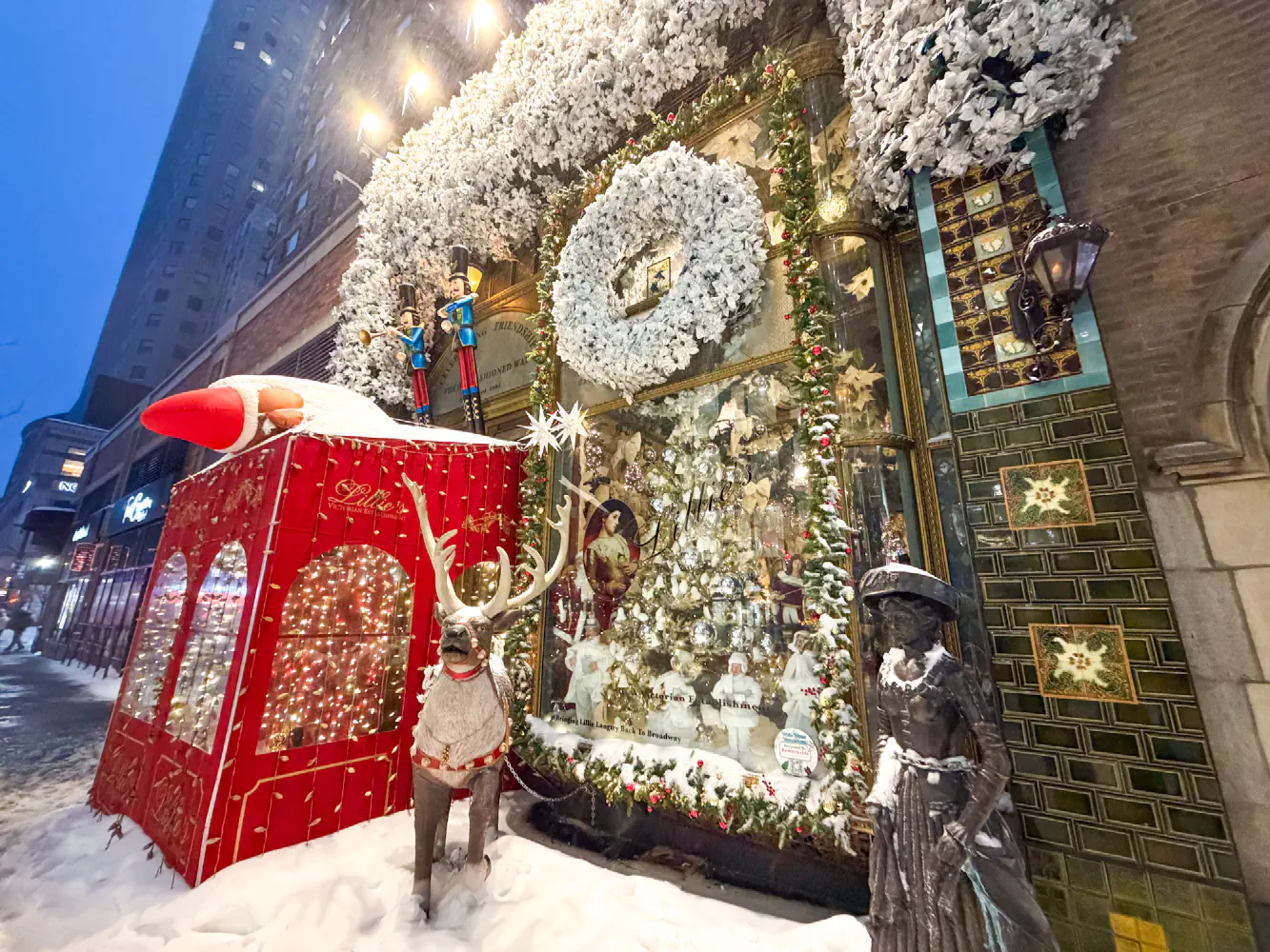 We’ve heard of Lillie’s Victorian Establishment, and it’s been on a list for a while because it’s a very festive restaurant. It’s always difficult to get last minute reservations, but fortunately as we won theater lottery on a cold single-digit weather, there was not a lot of tourist or foot traffic at all in the Times Square area. I was able to make a reservation for 2 for 5:30 PM very easily just a few hours in advance. As you can tell from the picture, there was a lot of snow, and the exterior was already decorated with a lot of winter ornaments.