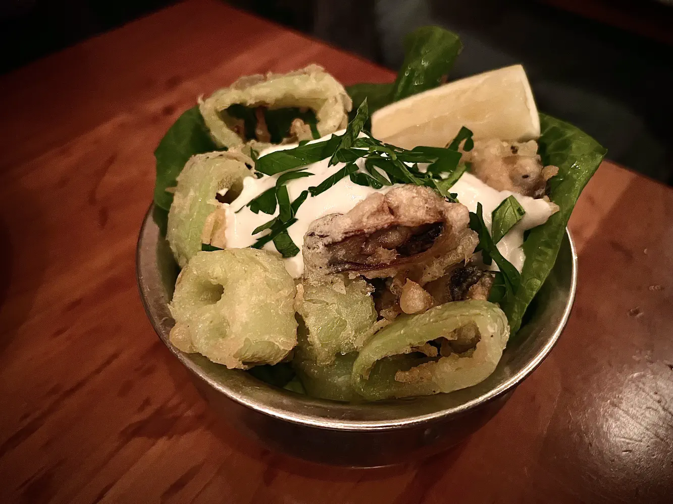 The Fried Mussels ($16) came with hot peppers and Turkish almond tarator sauce. This was probably my favorite for the savory side. The mussels were tasty, and the fried hot peppers weren’t spicy at all. They actually reminded me a little of pepperoncini, where there was a little sourness to them. The almond tarator sauce reminded me of yogurt with nuttiness in it. It was all served in a shallow bed of butter lettuce, which was also edible.