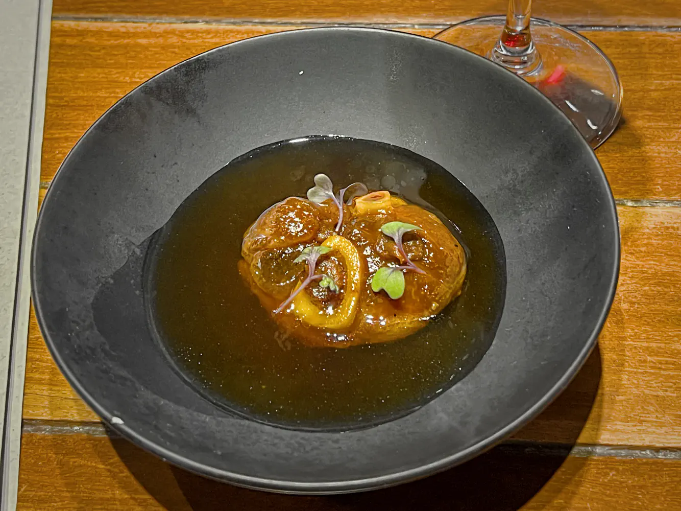 The Ossobuco was their conceptual dish. It was onion soup with pork ossobuco. The broth and everything was made from pork. The pork meat and bones were a bit hard as if they were sitting there, but they did fall off the bone when you chucked at it. The soup definitely reminded me of a French onion soup but with a slightly different flavor due to the pork bones.