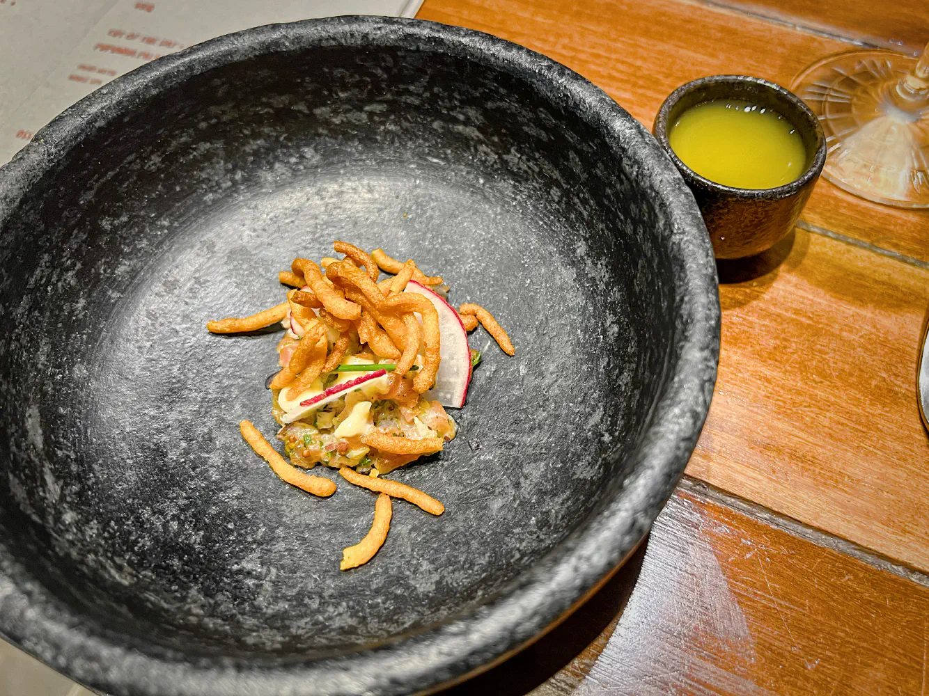 The pork tartare came from pork loin, radish, and crispy daily tubers. It was served with a citrus shot that they ask you to finish at the end. At first glance, eating pork tartare seemed like it was going to be the death of me, but it was actually really good. I will be honest that I was nervous eating raw pork tartare in another country. The citrus shot was a good palette cleanser.