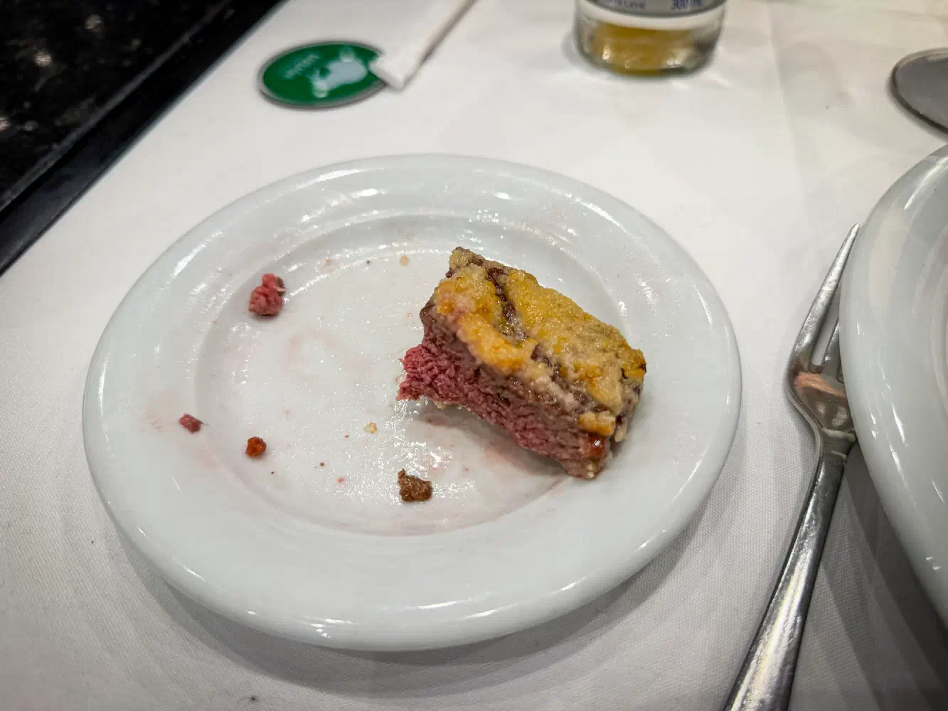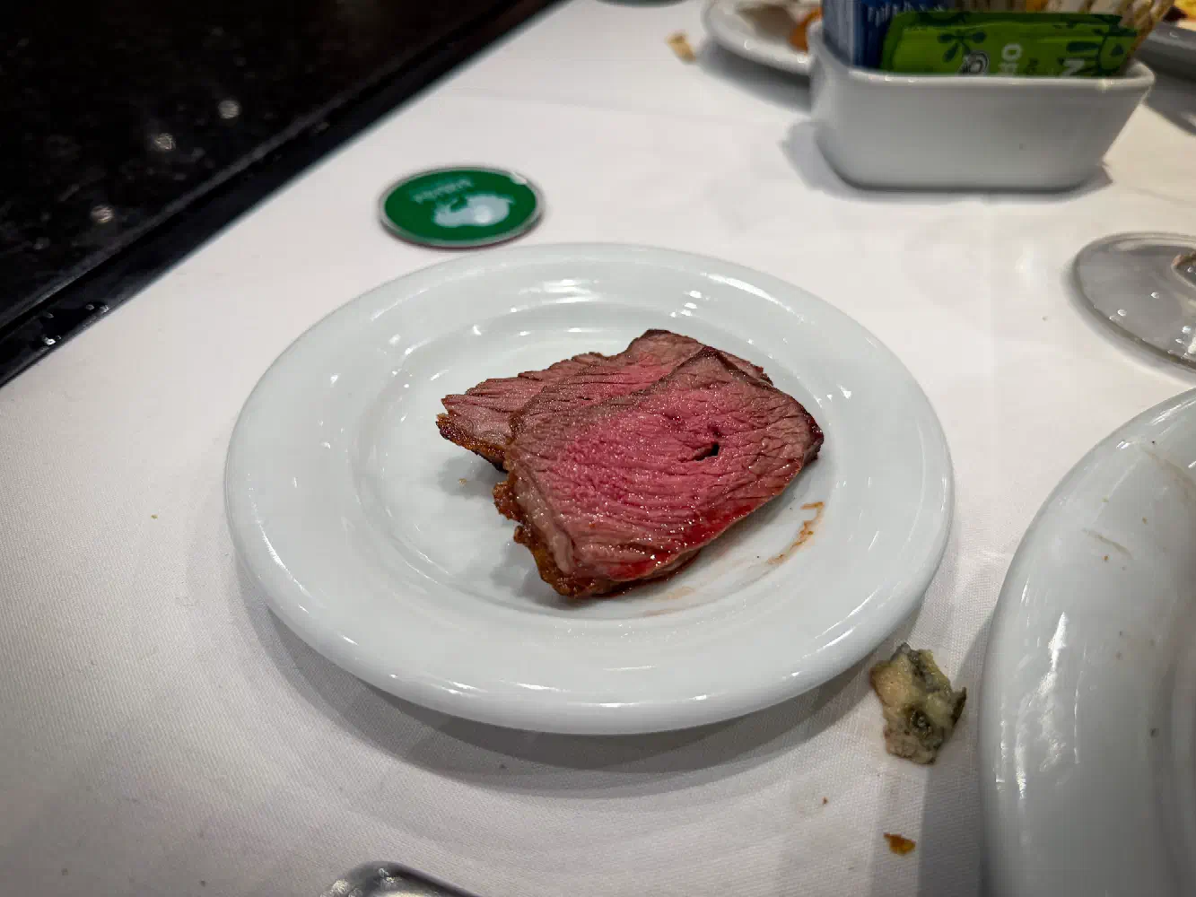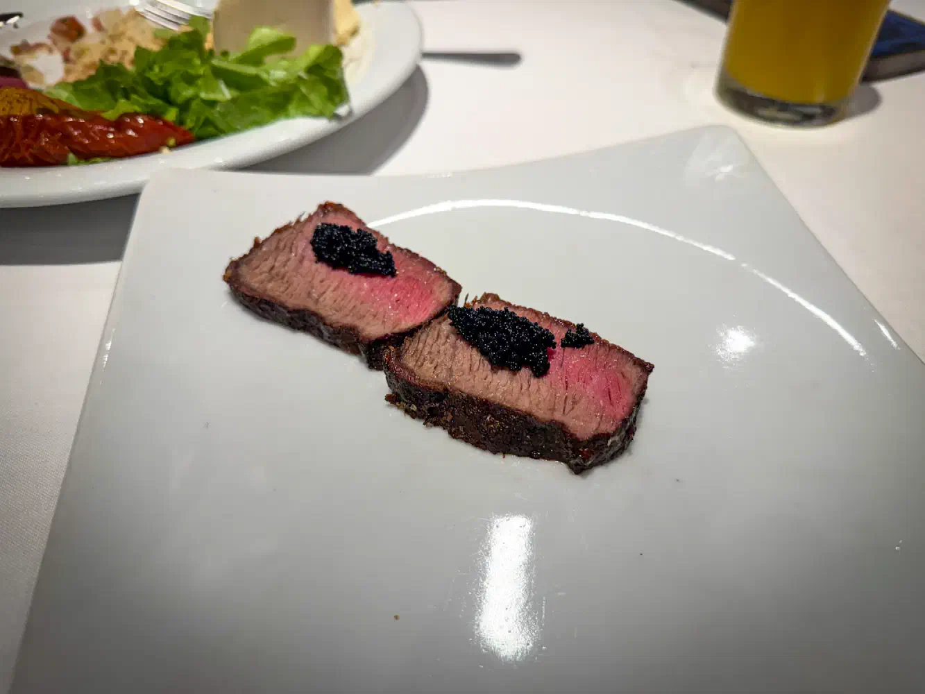 Lastly, we ordered the special cut with caviar. Apparently in this restaurant, you have to request this to happen for some reason. As you can tell when they serve it, it’s not very attractive. The meat right away looks completely overcooked. On top of the steak, they add what appears to be the same caviar that you can get in the salad bar. When you bite into it, my first thought was it tasted like a very dense seaweed flavor wrapped around the textures of a grainy, well-done meat. This capped the night with a feeling of social media has tricked us again!