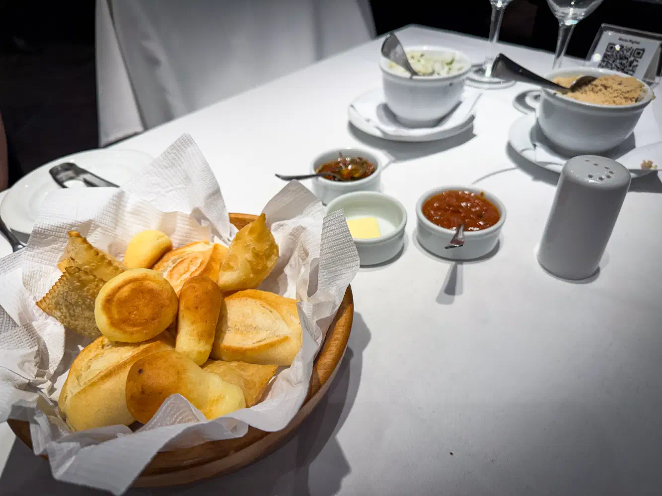 Once we sat down, the provided many sides of pastels, breads, farofa, vinaigrette, and hot sauce. The pastels were decent, but the cheese bread was definitely underwhelming. They were not airy, and some felt they were left out in the open for a bit too long.