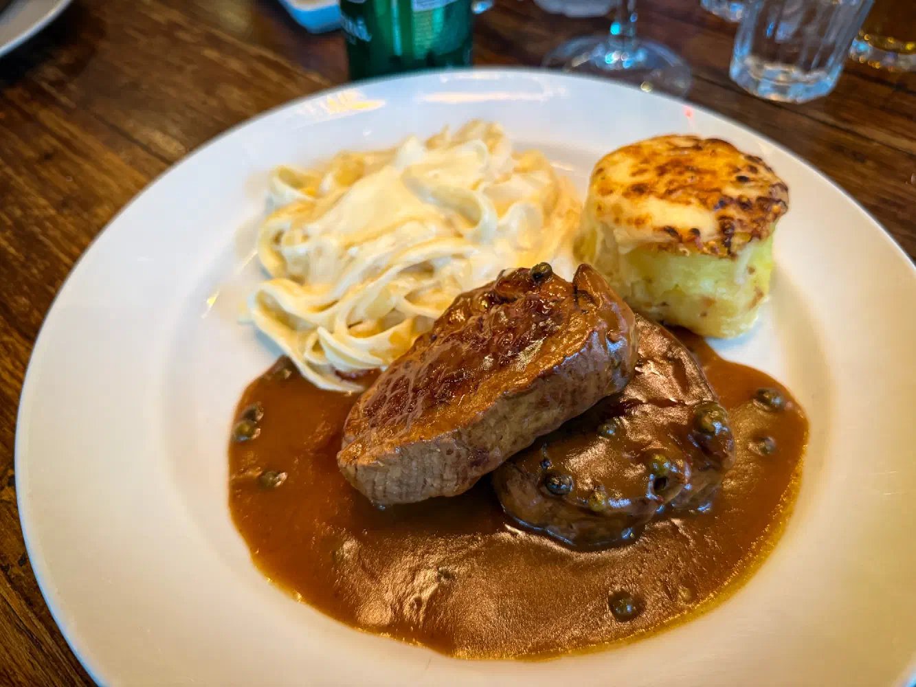 The Medalhão À Walter Mancini (R$158) came with 2 filet mignon medallions on an au poivre sauce, fresh pasta with white sauce, and potato gratin. The filet medallions were unfortunately overcooked, and the portion sizing was quite small. The pasta was surprisingly decent along with the potato gratin. The filet should have been the star though.