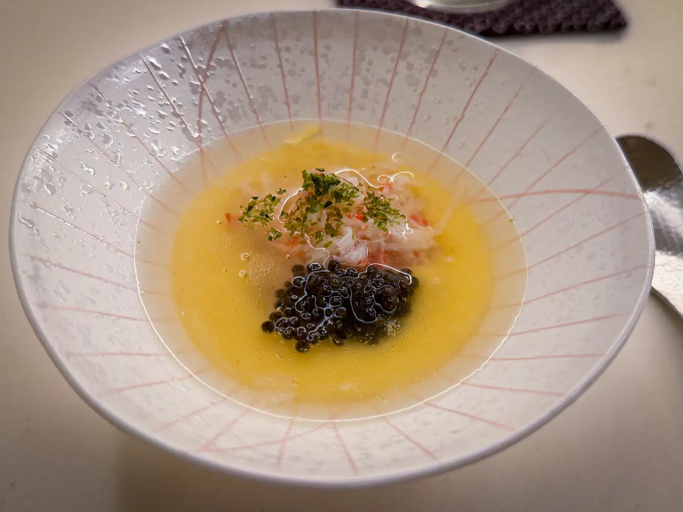 The Batata-baroa, Snowcrab, Caviar seemingly looks like a play on chawanmushi. For the starch, they use Brazilian mandioquinha, which is less earthy but somewhat close to a parsnip. It naturally has a lot of starch, and they made a puree out of it. The broth is made from the shell of the snow crab meat. I love the kitchen’s use of Brazilian ingredients to present an alternative side to typical Japanese dishes.