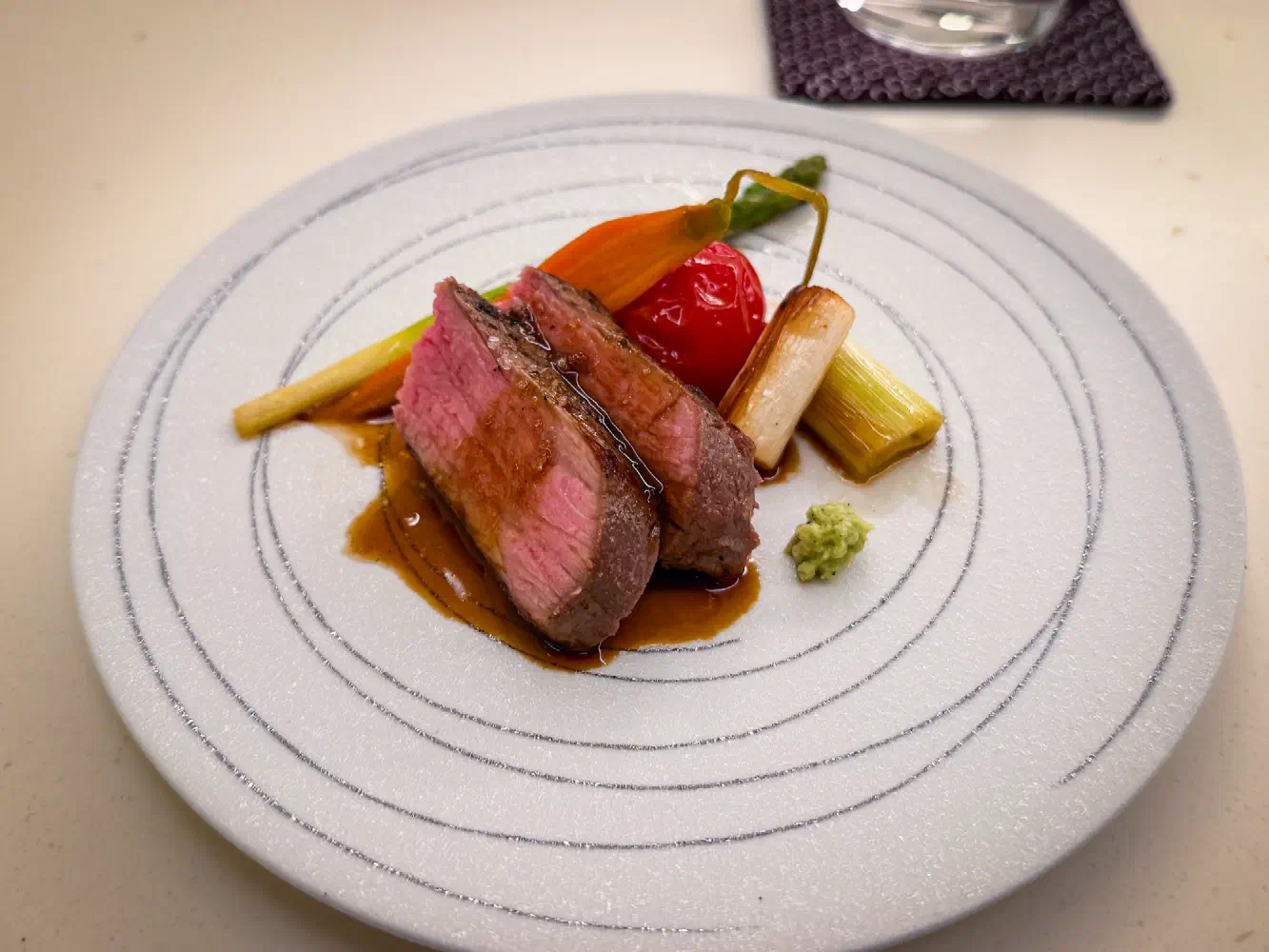 The Strip Loin, Wasabi, Sherry Demi-Glace was our meat course. This was a Brazilian wagyu cut, served with grilled vegetables and a vinegar sauce which is similar to Japanese yakiniku sauce. I had no idea there was such a thing as Brazilian wagyu, but this was quite incredible. The sirloin wagyu cut was quite dense, almost like a NY strip, but when you bit into it, it just melts like butter. When you look at it, you’d think it would just have normal steak texture. It was also incredibly flavorful as well. Wagyu tends to come out very fatty and not a lot of flavor, so this was an interesting change of direction. The vegetables are all pretty straight forward, but the star here obviously is the steak.