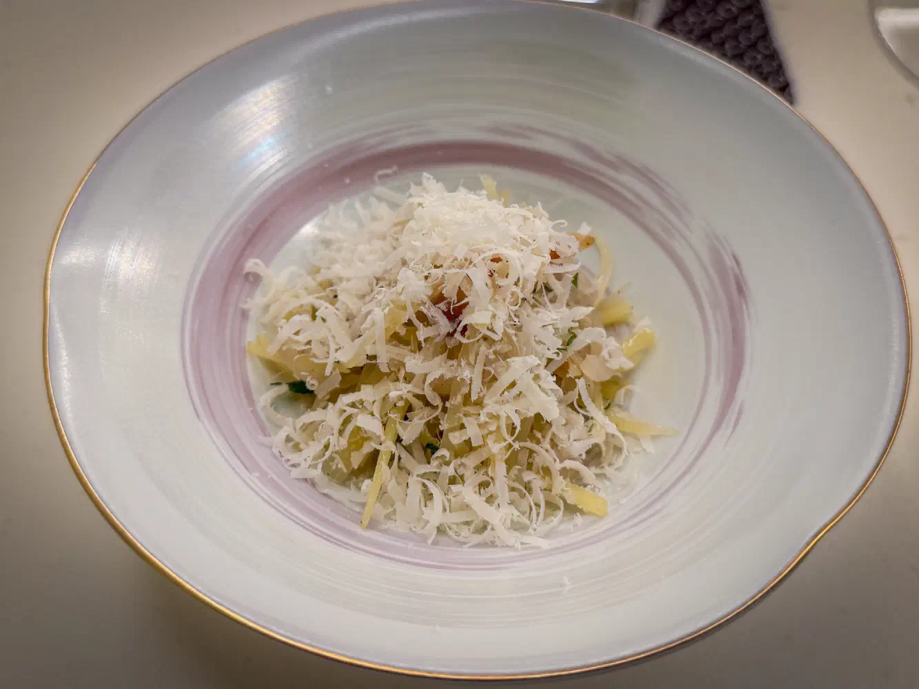 This is a Welcome Dish, that they serve as a staff meal. It’s kind of a play on carbonara, where it’s sliced potato, quickly sauteed and served with cheese and some vegetables.
