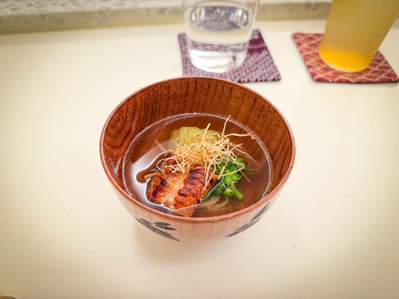 This is the Unagi, Seasonal Vegetables, and Dashi. It’s a clean broth with Japanese aubergine, broccoli, with crispy burdock root on top. This soup was very flavorful despite being light in texture.