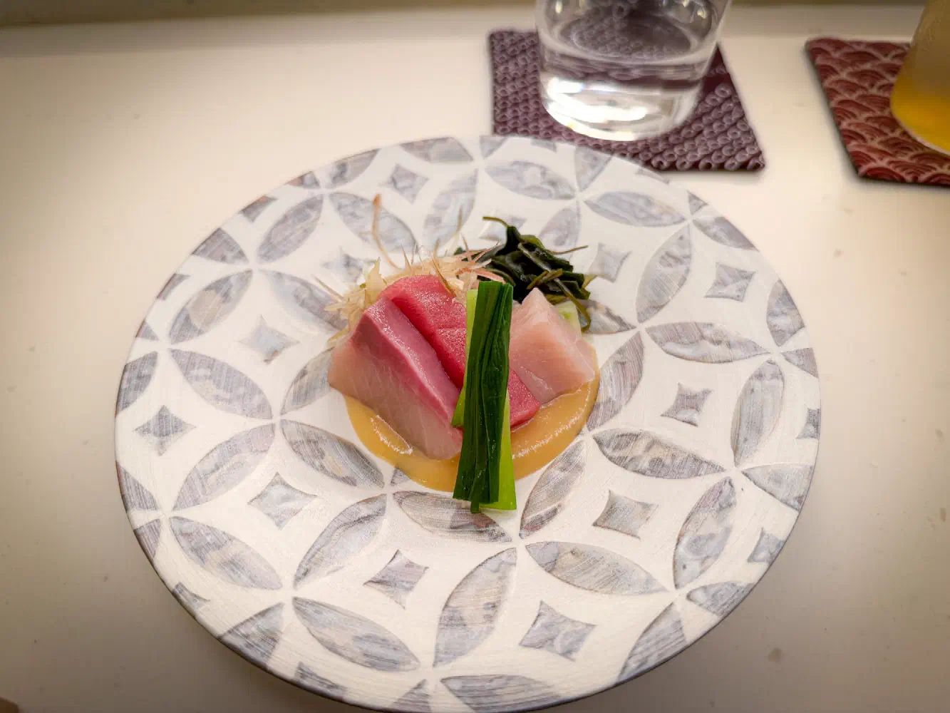 The Toro, Hamachi, Karashi Su-miso came with miso and rice vinegar. Instead of wasabi, they use Japanese mustard. They provided some scallion like vegetable cuts, which provided the fragrance of a young ginger. It surprisingly did not bother my partner who loathes ginger.