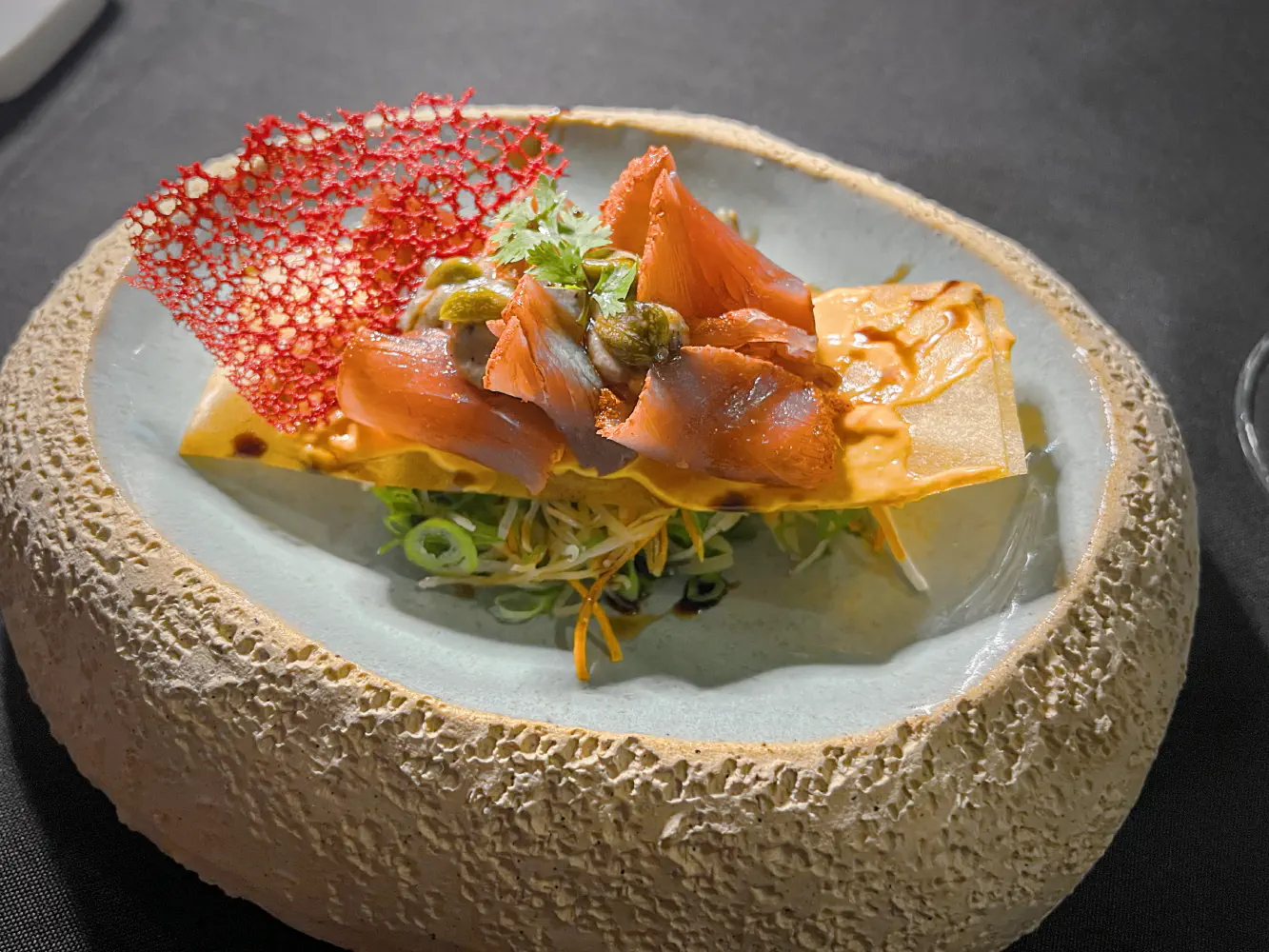 - Atum (tuna) topped with small cuts of scallop with ginger and green onions, and black truffle oil.