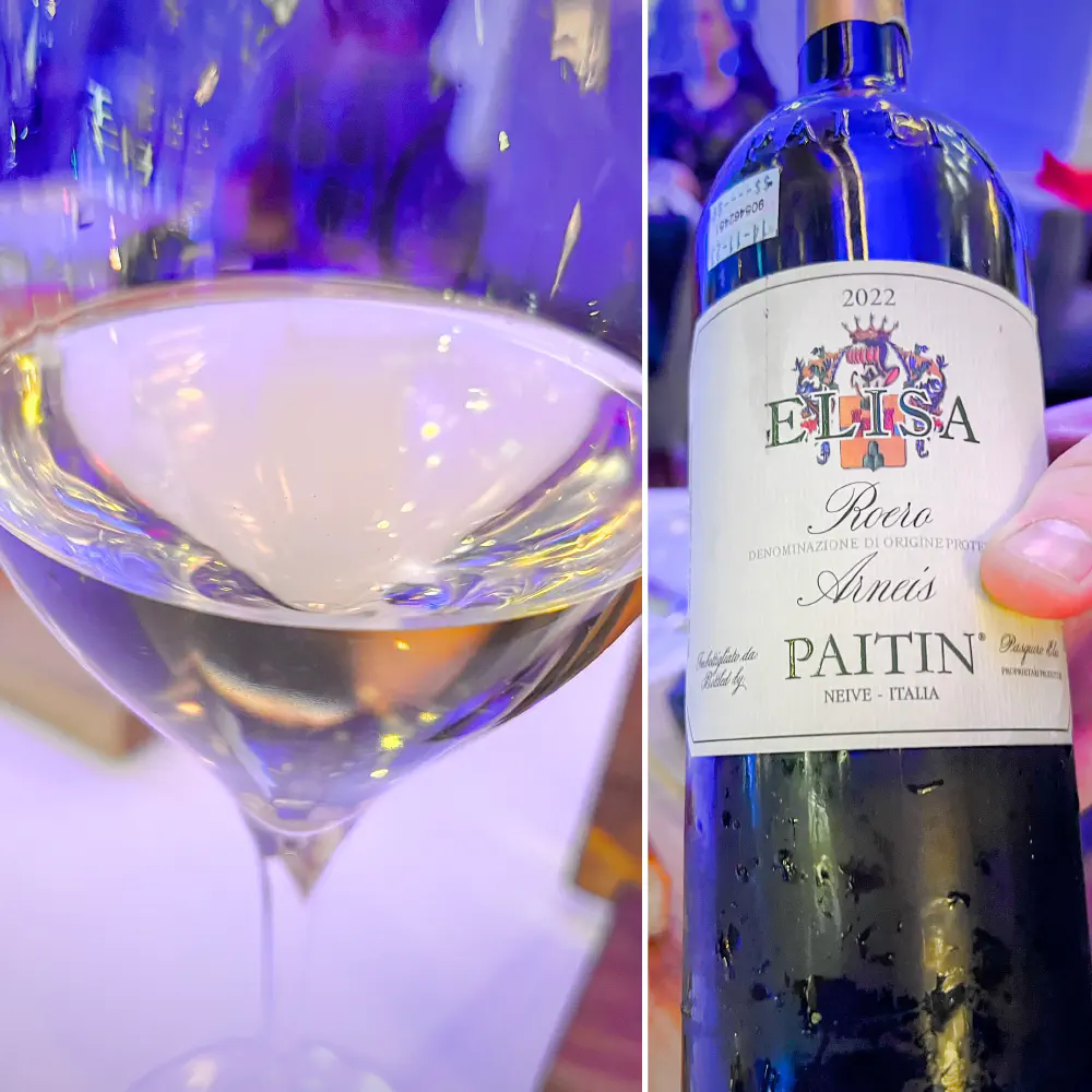 Around this time, I ordered a glass of Roero Arneis ($26 CAD, ~$19 USD) which came from Paitin, Elisa, 2022. The wine was floral, not sweet, dry, had good minerality with tree fruit sensations. It was flavorful to the tongue, and it finishes with a bit nutty sensations.