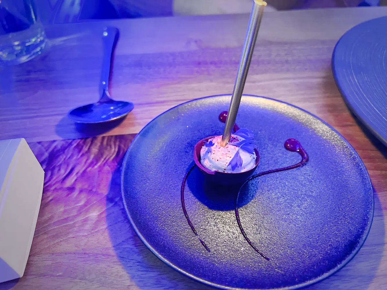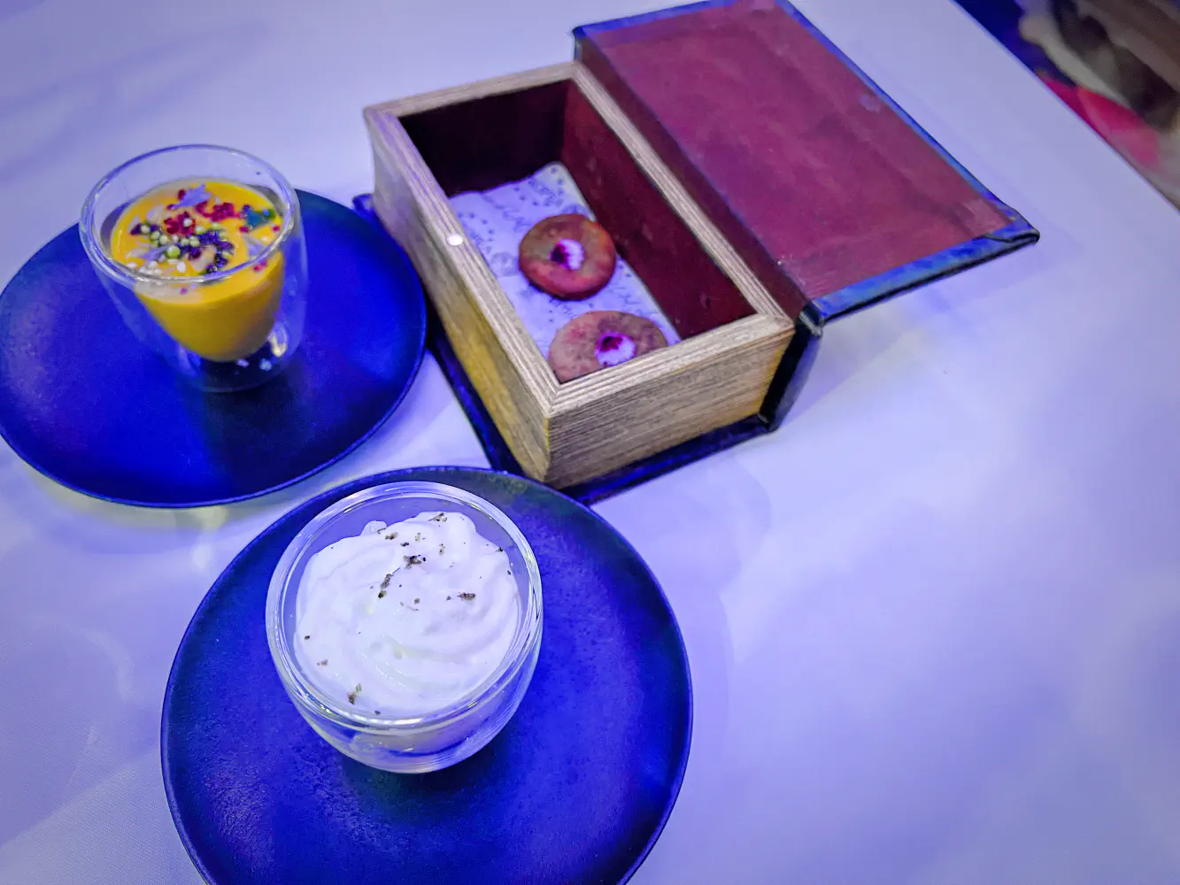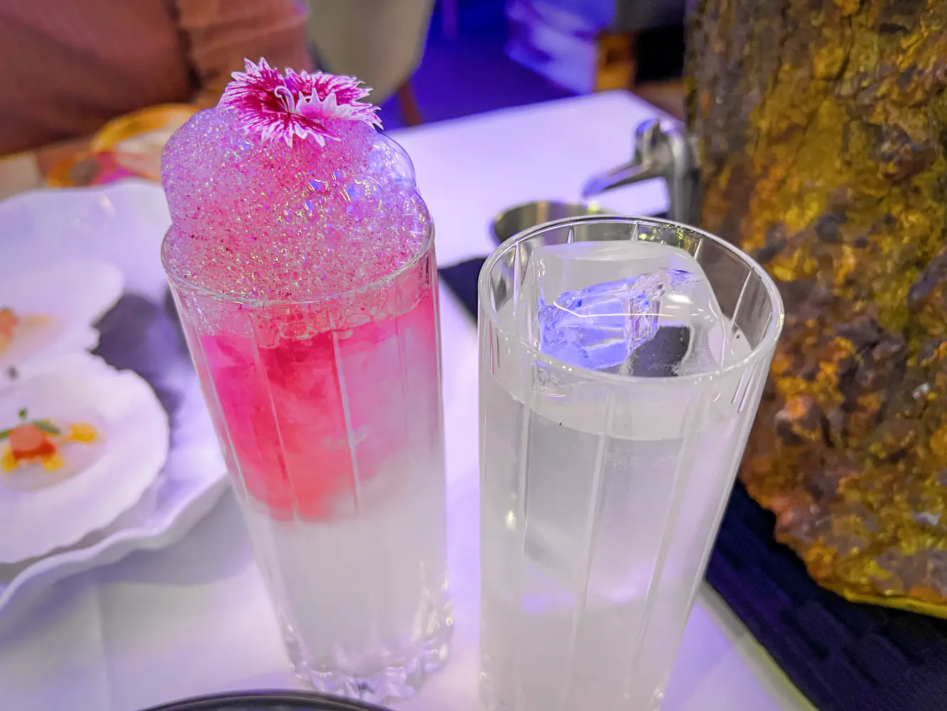 In the room that we sat in for this tasting experience, there was a lot of blue lighting. It felt like you were in a tall, modern room with a European club-like vibe. Luckily, it wasn’t too noisy.