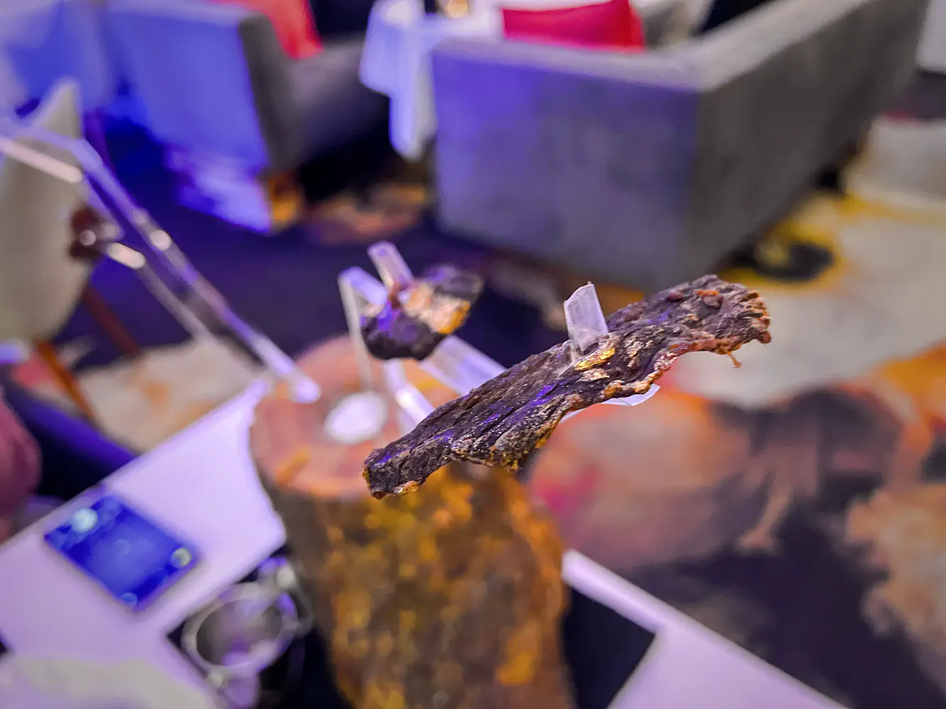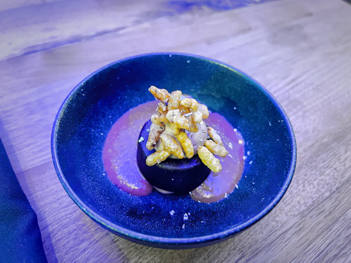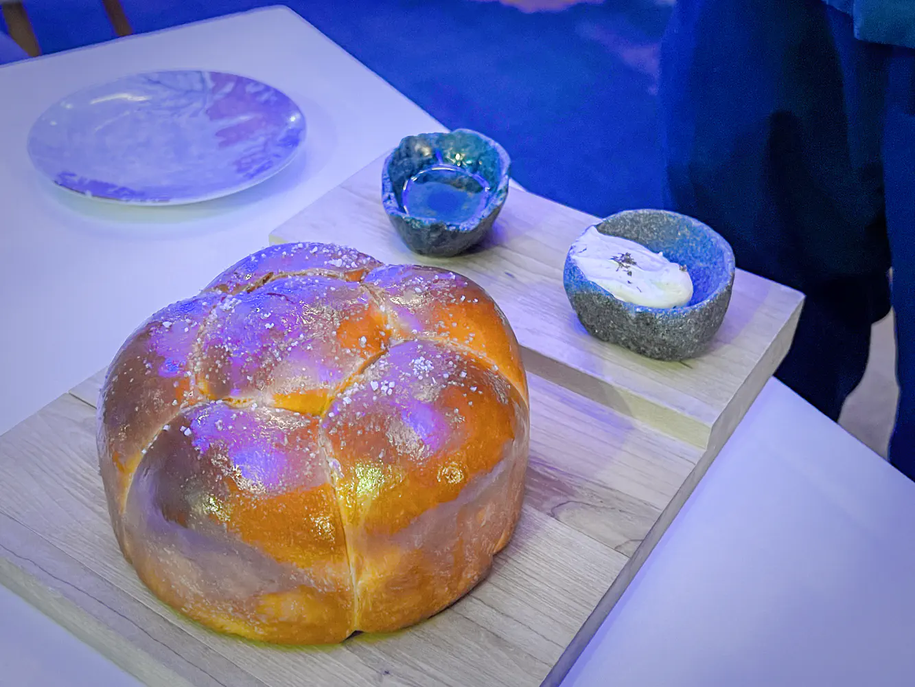 In the room that we sat in for this tasting experience, there was a lot of blue lighting. It felt like you were in a tall, modern room with a European club-like vibe. Luckily, it wasn’t too noisy.