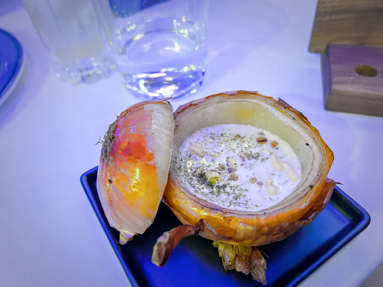 The Onion Soup came with chowder consistencies, puffed rice, and a white wine broth within a scooped out onion. It’s an interesting vessel for this. The chowder tasted fine.
