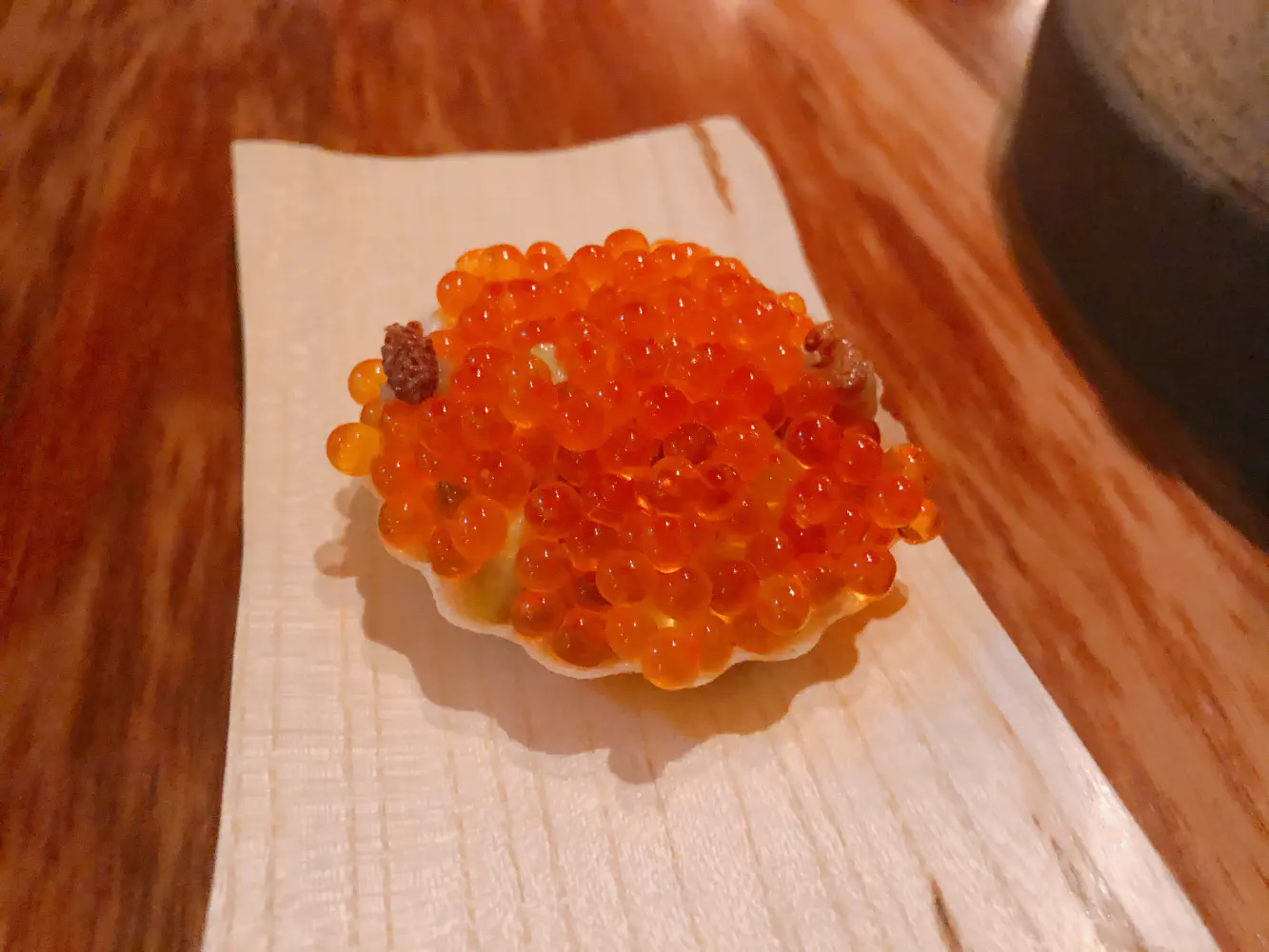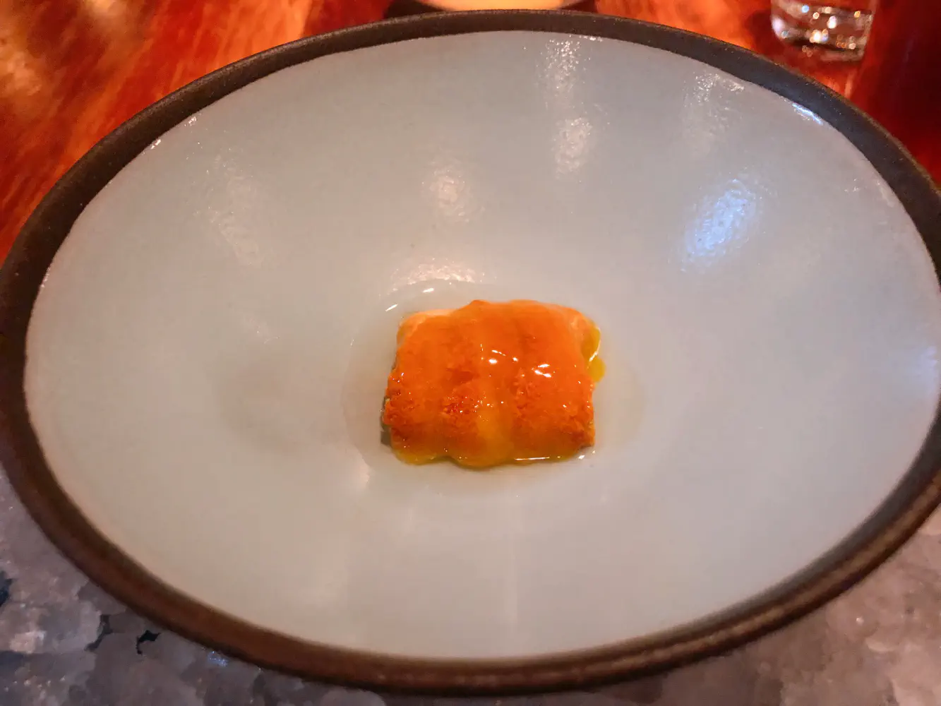 This is the Maine uni glazed in egg yolk. The texture on the uni was perfect. There was some yuzu in it, so you can taste the complement of the creamy uni butter flavor with the citrus.