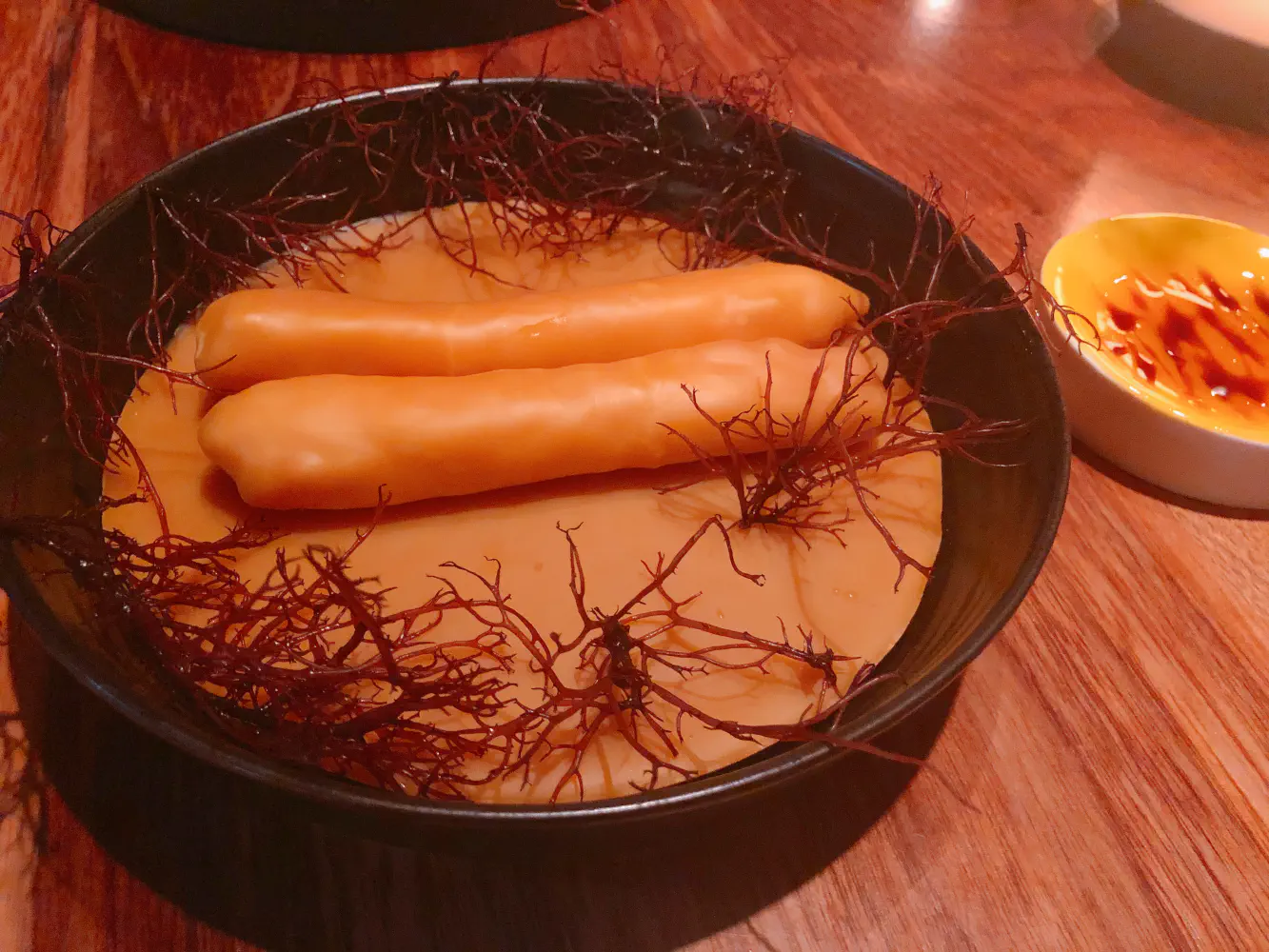 The next set of courses was centered around king crab. This is the king crab in beeswax. At first, I thought I was suppose to eat the casing too. But no, they ask that you break it in half and peel off the beeswax. On the side, there’s a dipping sauce of egg yolk and what I think is some type of soy sauce. The beeswax has a very distinct flavor that is kind of interesting. After they cook the crab, they encase it with the candle like taste of the beeswax. It’s not something I was super excited for, but I like the adventure they were looking for. The sauce though was really good. I took the crab leg and just threw it into that yolk soy sauce medley. You got the sweetness of the crab dampened by the thick creamy yolky flavors with the saltiness of the soy sauce.