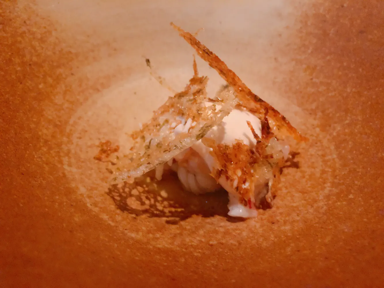 The next was the king crab meat with foie gras mousse. It had some sourdough chips in it. Everything was really good. The sweetness of the crab meat with the mousse is just perfection. My mental state was set in a good place after eating this.