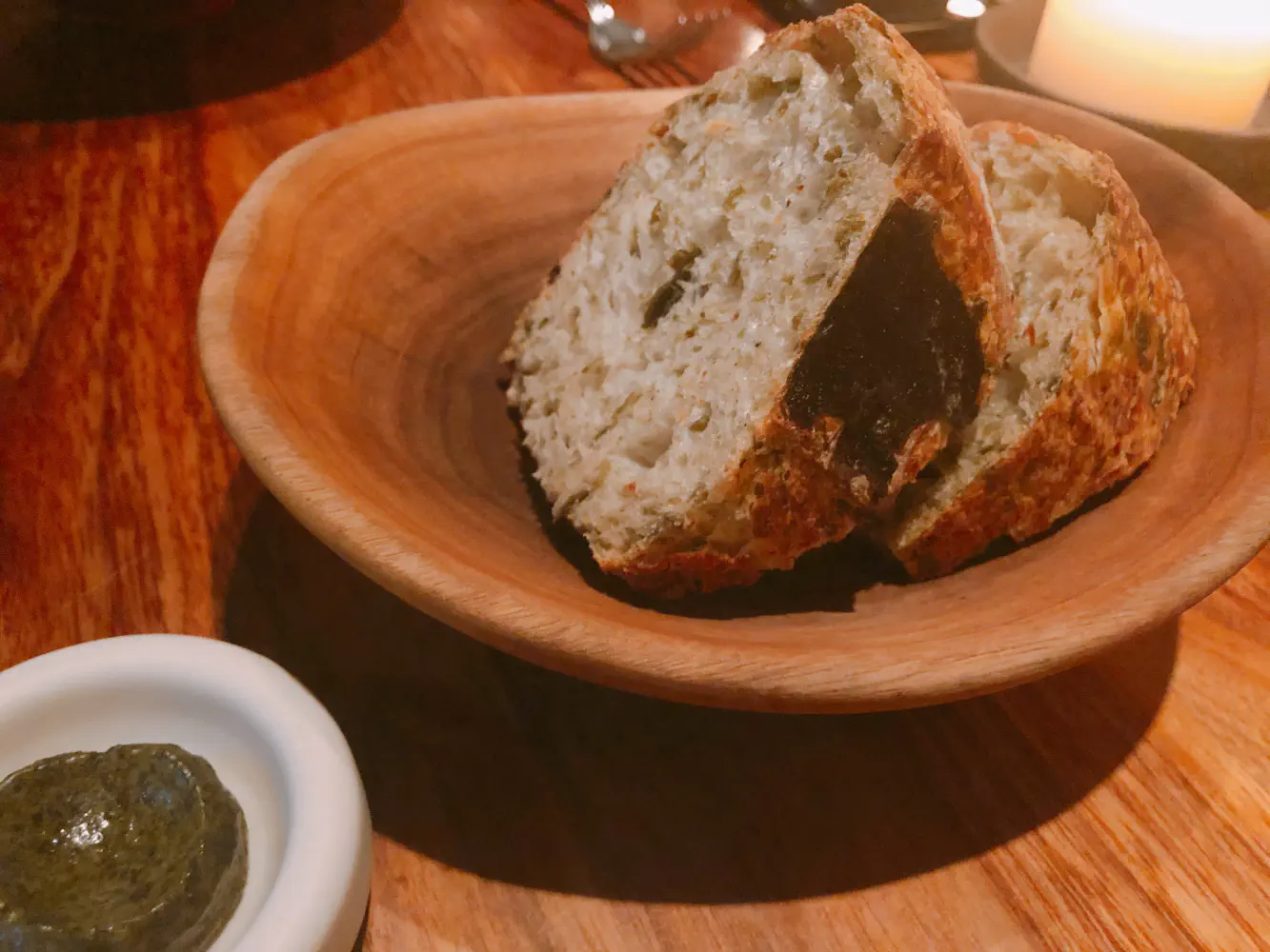 They broke up the pace now with some nori sourdough bread. At the bottom left is nori butter. As a person who loves eating seaweed, this bread was so unbelievably good. The sourdough had that nice sour kick, and the seaweed was very noticeable. Combined with the nori butter, it was just heaven. The seaweed adds a nice unusual flavor that makes your tongue dance around whenever it eats anything with seaweed in it. I would argue that the seaweed is as much of a star as the sourdough itself, and that really says something. If I had to fault one thing, I think the butter could have used just a hint of salt.