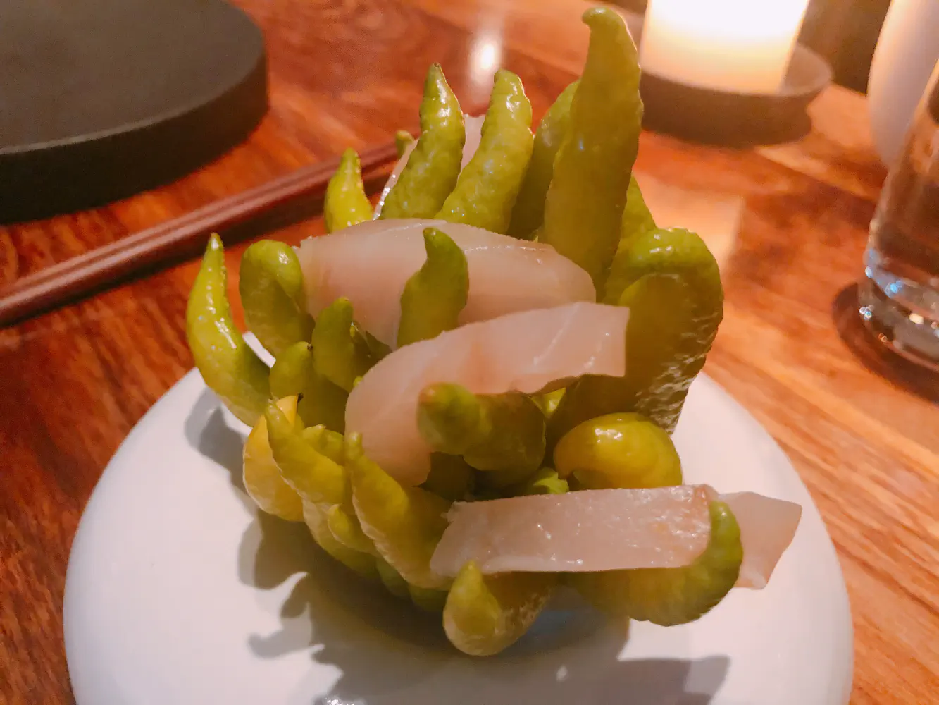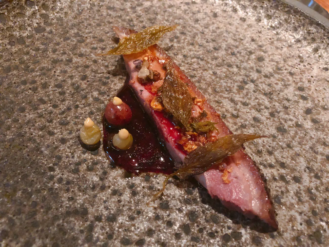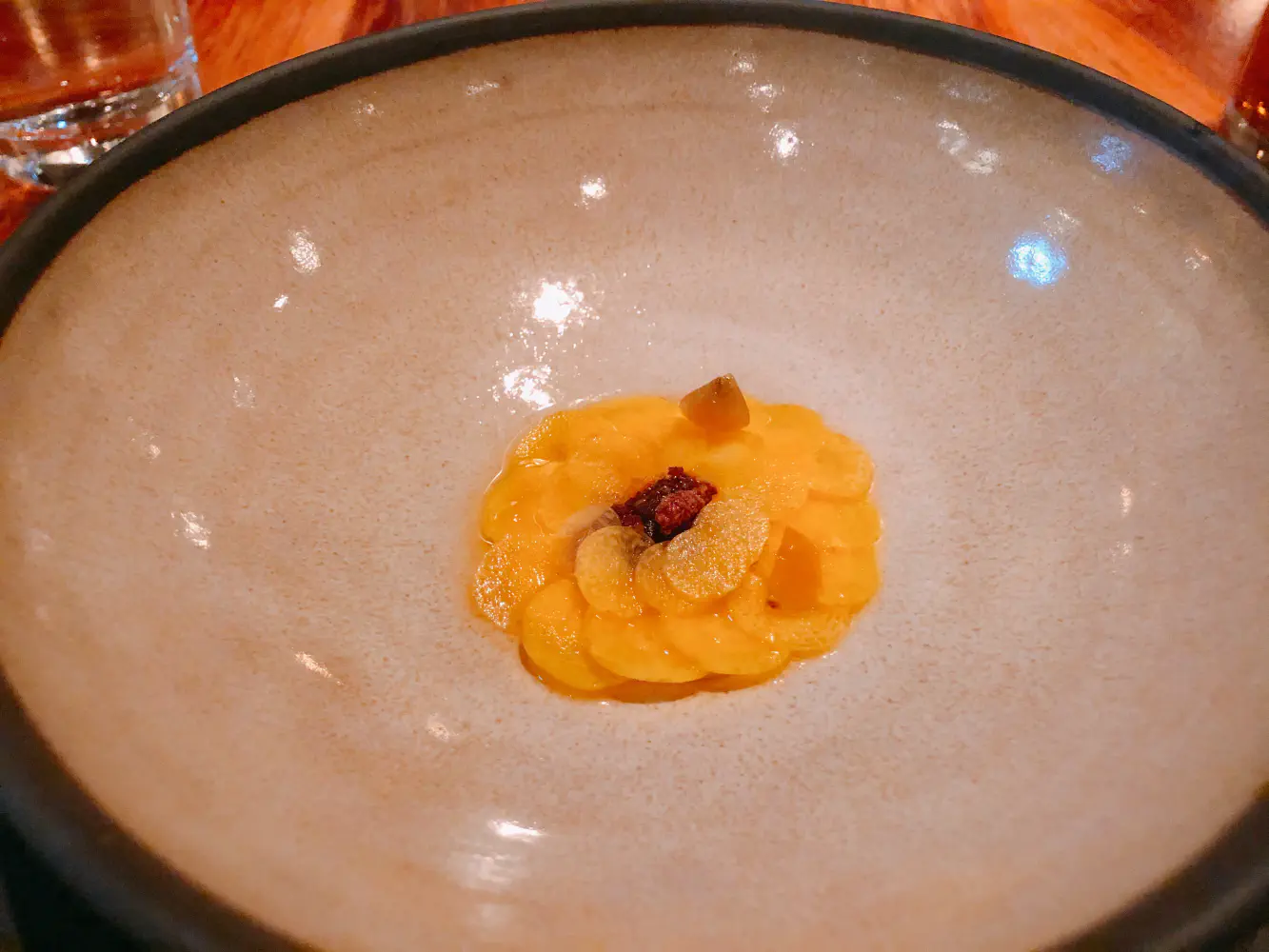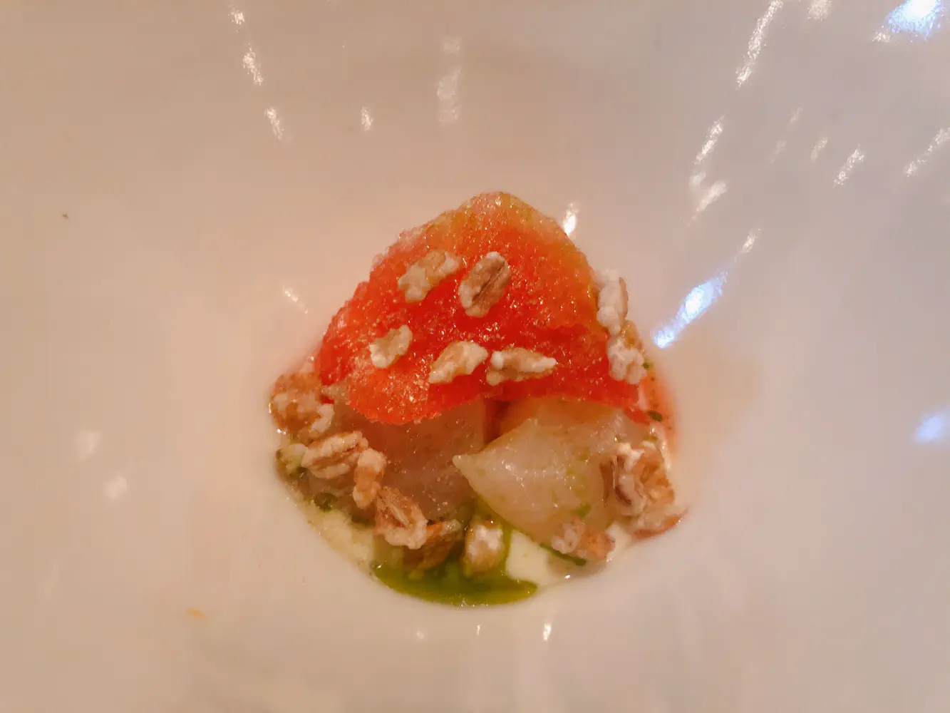 Next came the “the farm” carrot aguachile. This is the epitome of the farm to table concept as these carrots came from their local restaurant farm somewhere. The dish was very balanced. The carrots tasted subtly sweet, and the gooseberry was a little sweet with sour aftertones. There was what I thought a carrot pureé below the actual carrots.