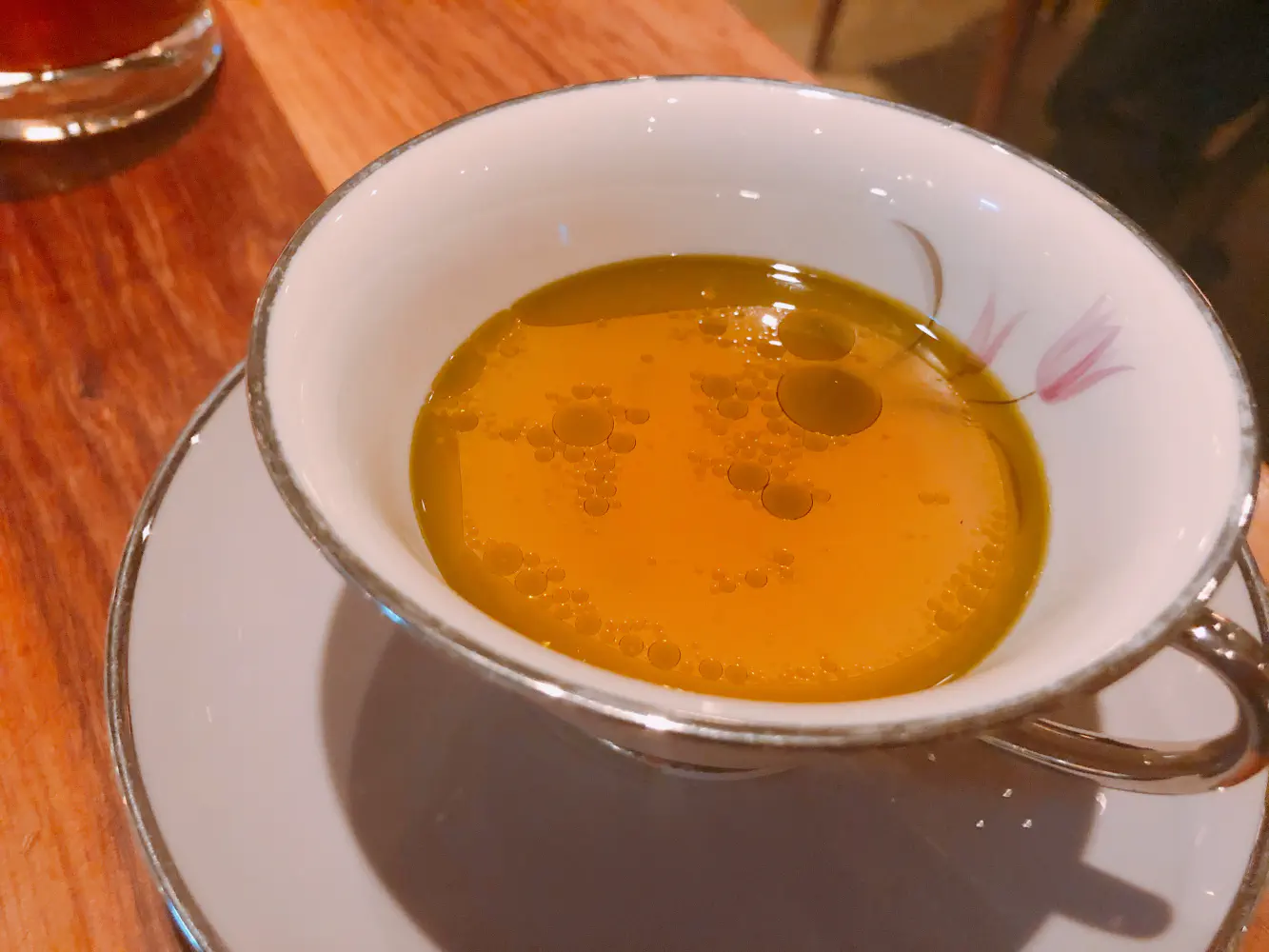 This is what I think was a green tea-like base for the precursor to the next few shima aji fish courses. They wanted to show how rich and pure the color was.