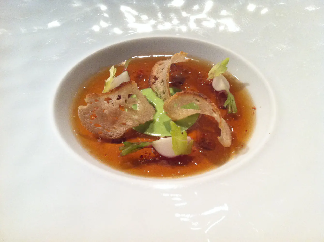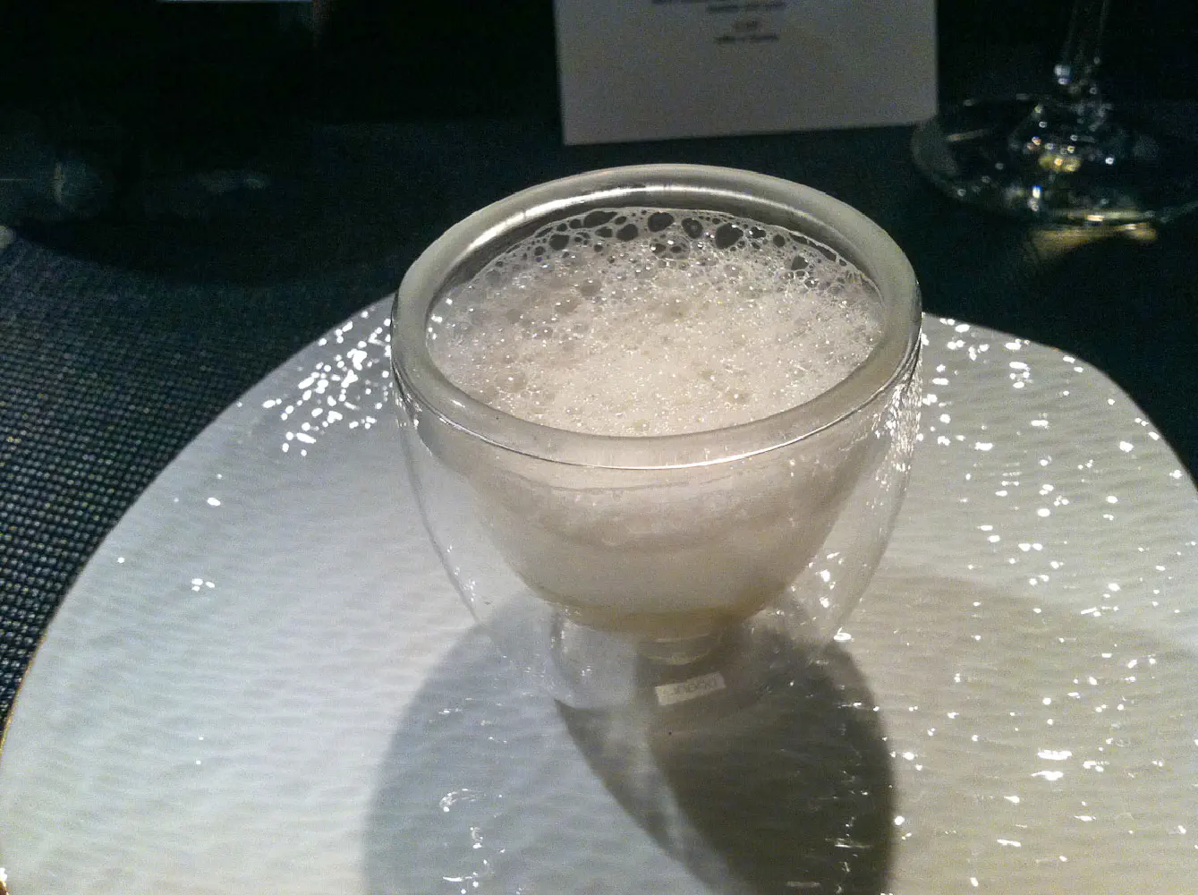 Second course was Le Celeri. This was celery mousse with wasabi, beef stew gelee (jelly), and foie gras. If you’ve ever made beef stew and after you refrigerate the broth, it sometimes turns into a jelly like texture. The foie gras was infused into the jelly, and the mouse provided a good counterbalance to the saltiness of the stew.