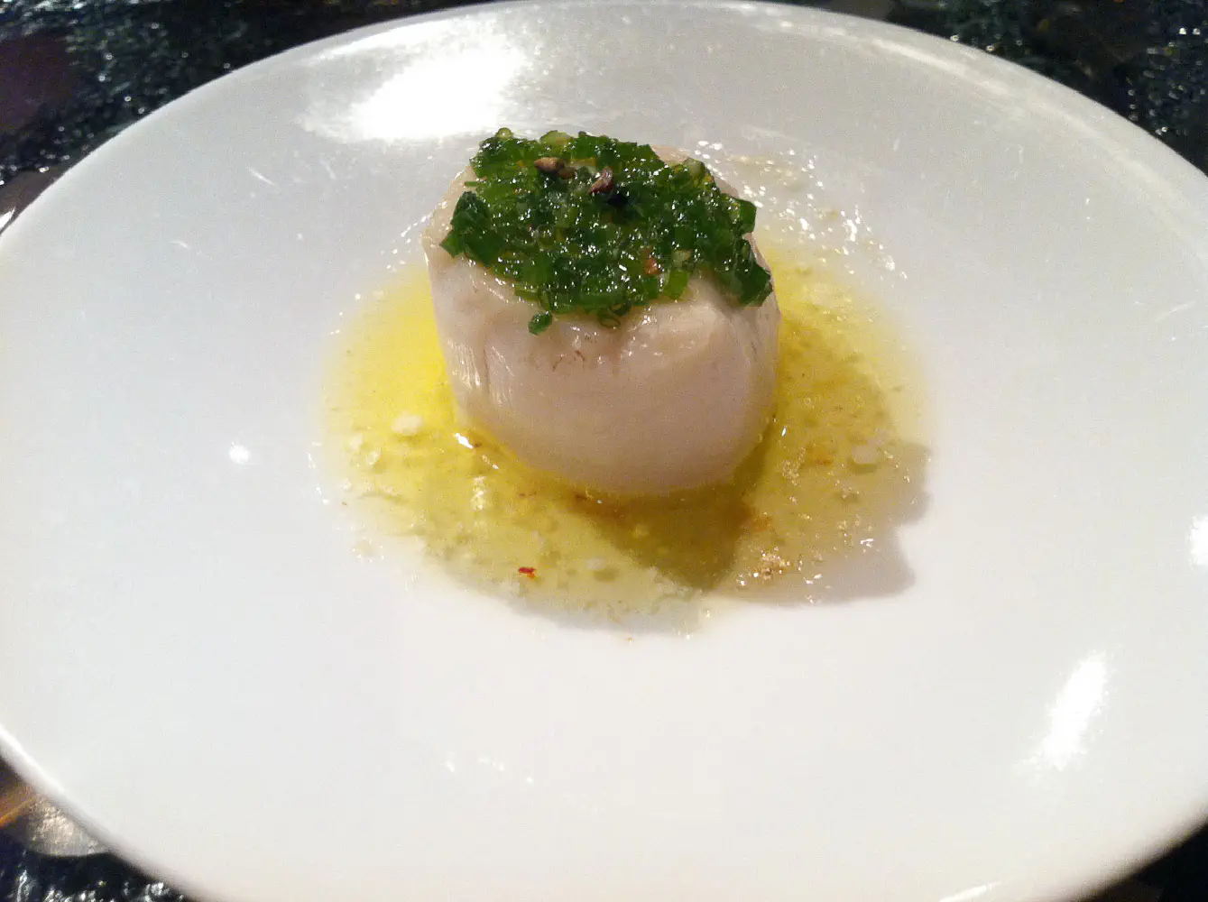 Third course was La Saint-Jacques. This is sea scallop cooked in the shell with chive oil. The base of the scallop is basically garlic butter. The scallop was super tender and perfectly seasoned along with the chive oil.