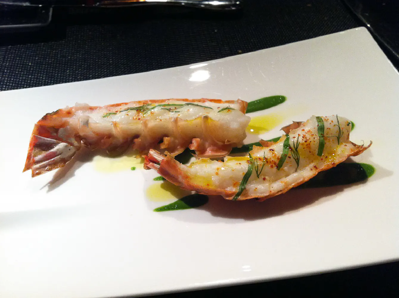 Fourth course was Les Langoustines. These are langoustines cooked in their shells with green curry and coconut milk. The green curry and coconut milk wasn’t particularly strong as expected which is good. I didn’t want that to override the taste of the langoustines. The langoustines were very tender and very good. It was amusing to watch other parties take the langoustine out of the shell. Some were a bloody mess, and others took the langoustine out like they were doctors. The langoustine was plump, tender, and sweet. So far through 4 courses, not one of the dishes were bad. Everything has been good so far.