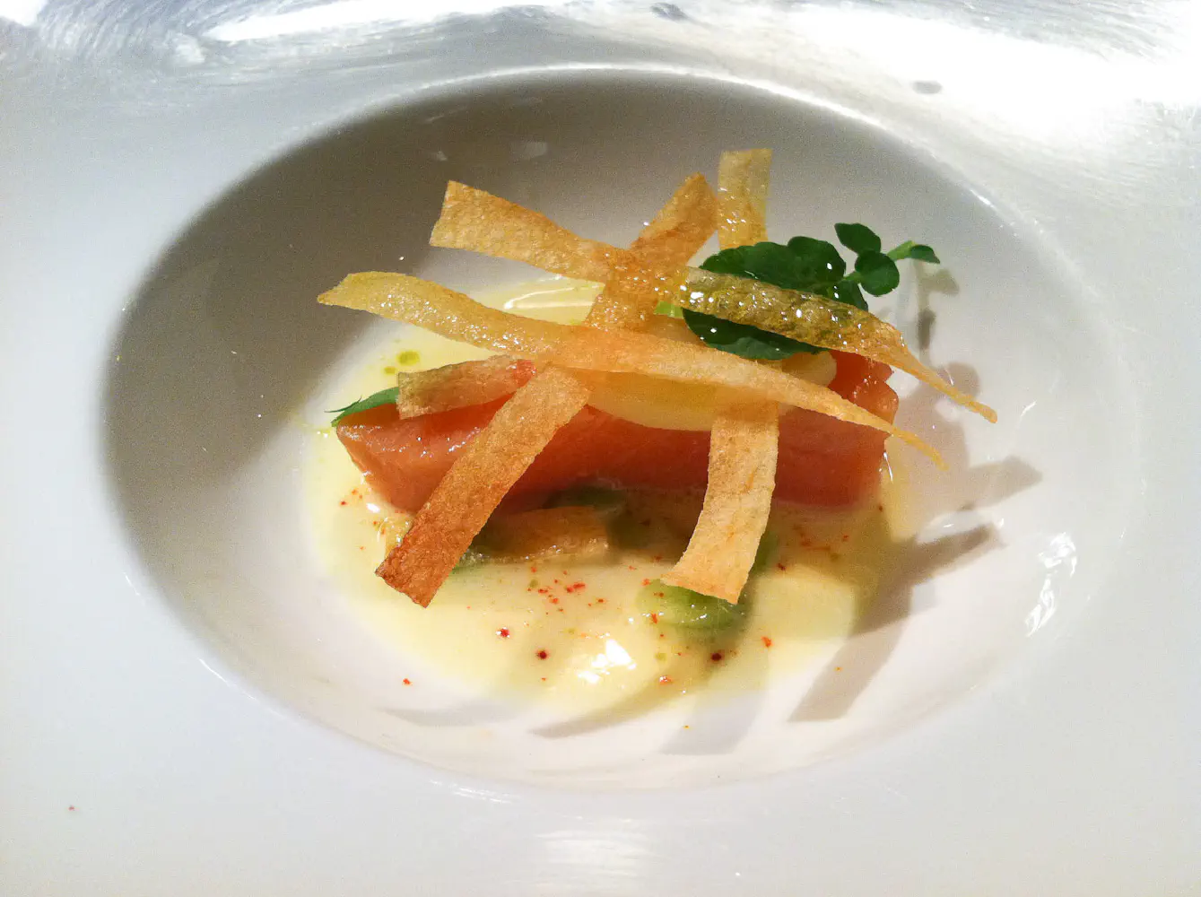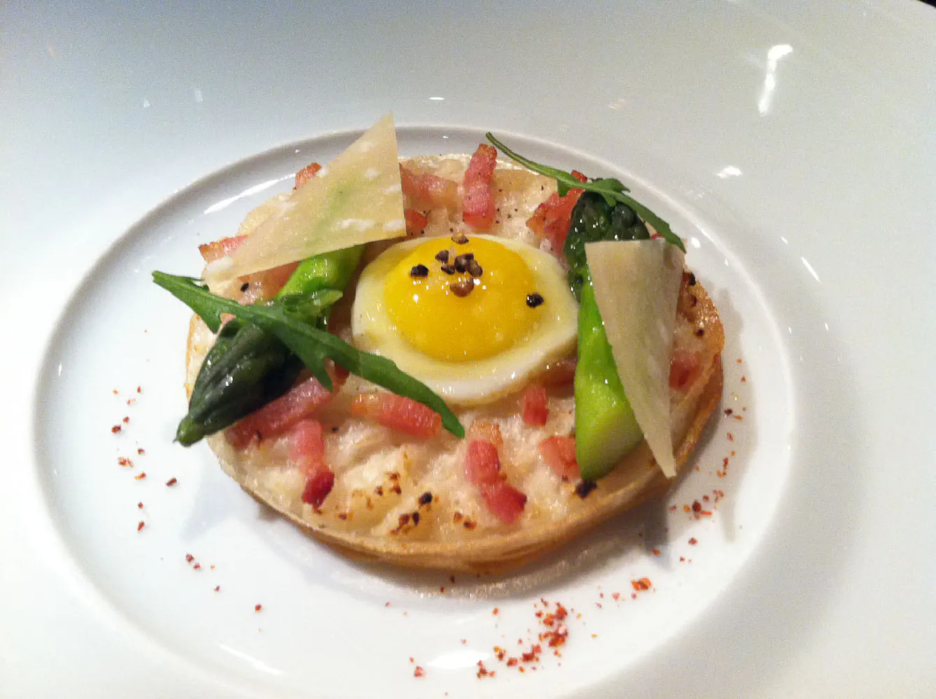 Fifth course was La Cebette. This is white onion tart with smoked bacon, quail egg “mirror”, and green asparagus. This was interesting because it looks like breakfast food, and it even tasted like breakfast food. Imagine eating an English muffin with an egg and some bacon on it. This was not too far off except for one major distinct difference: there were no processed ingredients in this. The “English muffin” which is basically the white onion tart was delicious. It was crunchy almost like a very crispy hash brown.