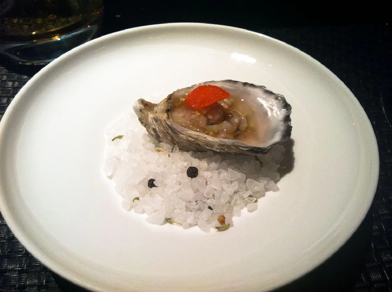 On the house from the chef is this market oyster. I think they said it was a kumamoto, but I’m not entirely sure. It had piquilo pepper, Tabasco sorbet, and aged tequila Mignonette. It tasted pretty good. Excellent start for the night.
