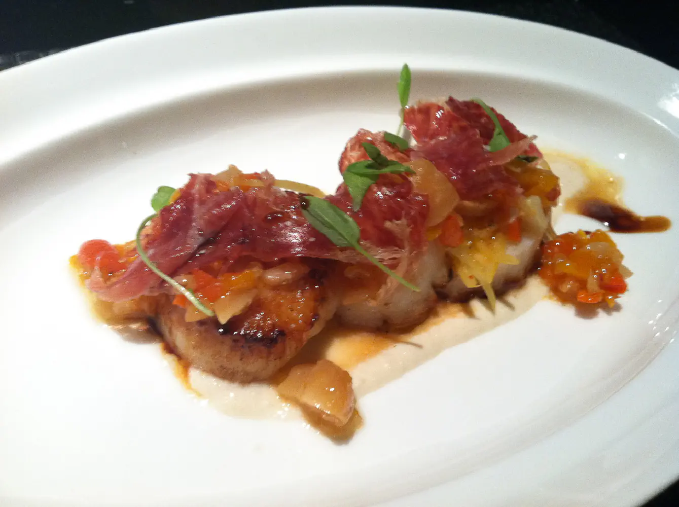 The third course is the pan roasted sea scallop with jamon iberico, chopped romesco, and a creamy cauliflower sauce. The scallops were cooked perfectly and were very tender. Coupled with the different ingredients, you basically tasted scallop with some sweet kick to it. So far, this was my favorite even though it wasn’t that memorable.