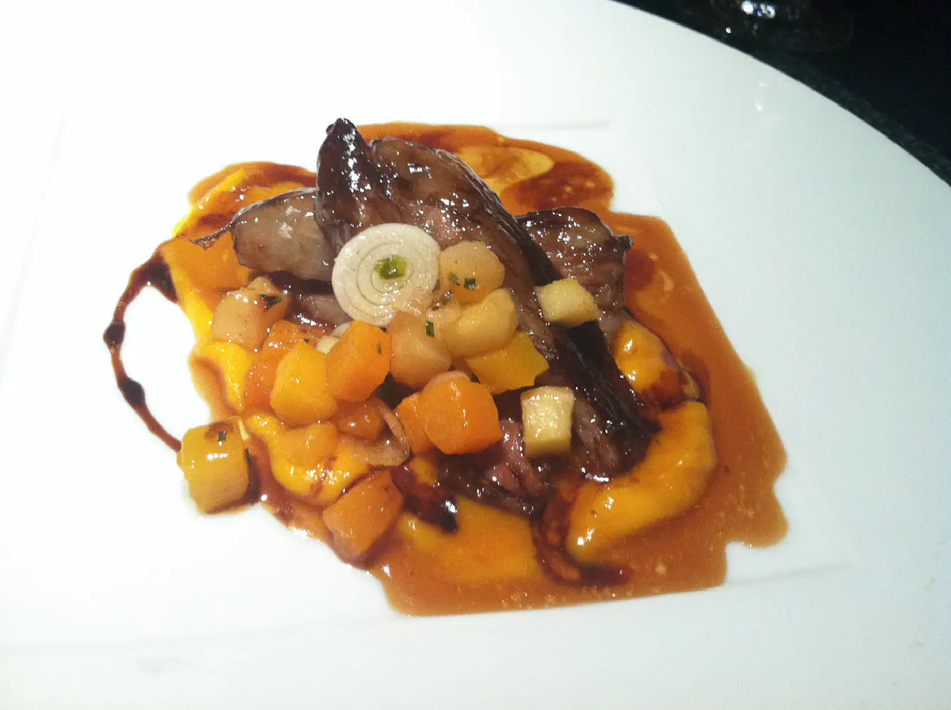 The fifth course is the 48 hour beef belly with caraway spiced heirloom squash and roasted quince. If you’ve ever had braised beef in some type of reduction sauce, this is basically it with one exception. The beef belly was VERY heavy in fat and flavor. What I mean by this is that it’s literally like eating a spoonful of roasted bone marrow with some strands of meat in it. The beef belly was very tender, but it was just extremely fatty and rich.