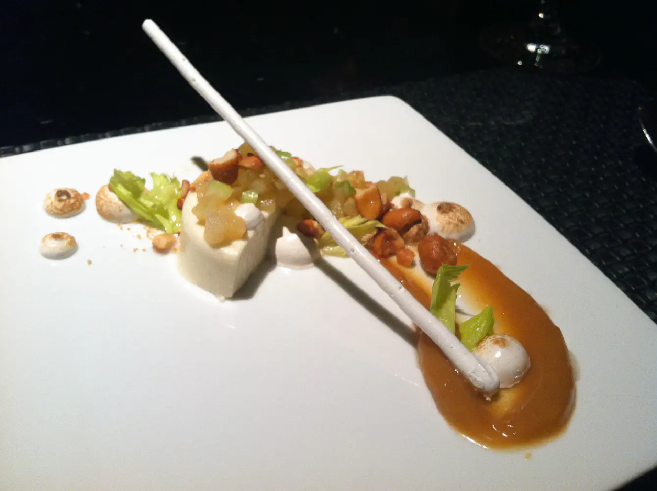 The last course is the dessert, which is green apple mousse with peanut butter cream, celery leaf, and autumn spice. The green apple mousse reminded me of almond tofu in some ways. I didn’t really taste the green apple flavor that much for some reason. There were some marshmallows that have been singed to the plate. The peanut butter cream was a decent complement to the mousse though, but I found the celery leaves added absolutely nothing to the taste other than making the plate look nice. The peanut butter cream was very powerful and was similar to eating caramel just with peanut flavors. The long stick is some type of candy that cracks like a hollowed thin candy cane. This dessert was just ok.