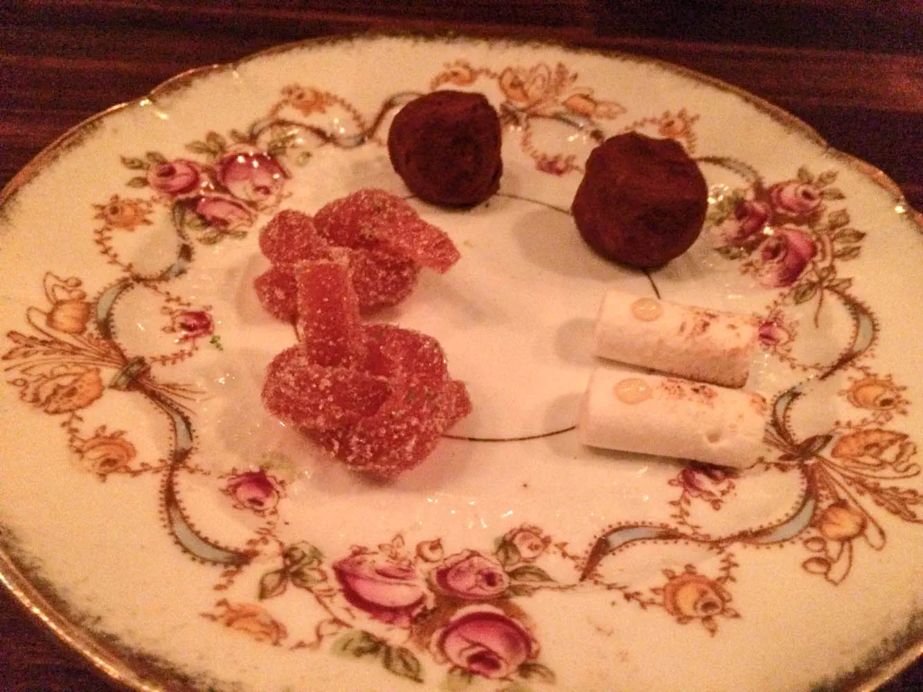 Lastly, we have a trio of desserts. Starting left and going clockwise, we have cactus pear pate de fruit in a lime sugar, pear marshmallow with Tasmanian honey, and dark chocolate and caramel truffle. The cactus pear pate de fruit as usual is very nice and gummy. The marshmallow did taste like pear, and the little drop of honey was fairly potent. Lastly, the dark chocolate with caramel ooze inside was quite delicious.