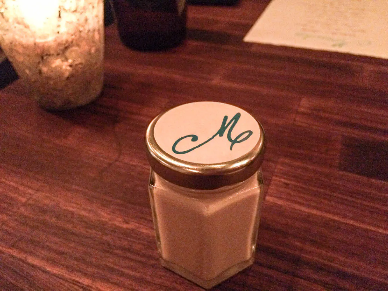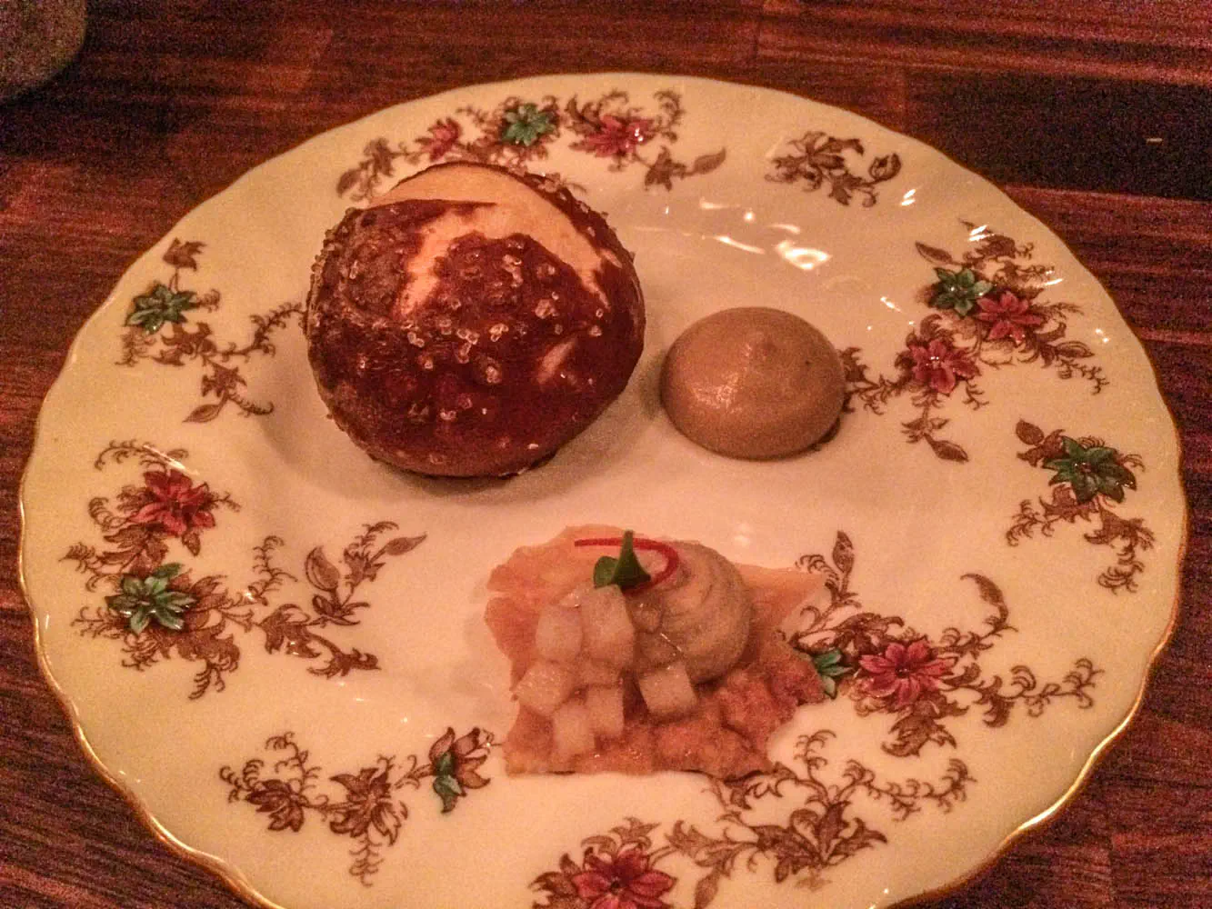 1. Oyster Chicken Pretzel. The big brown ball is the pretzel bread. On the bottom is chicken skin with some pears and something else that I don’t quite remember. The top right is pear mustard, which by the way was very interesting and delicious. I genuinely lathered the mustard onto the pretzel bread, and it was a great compliment.