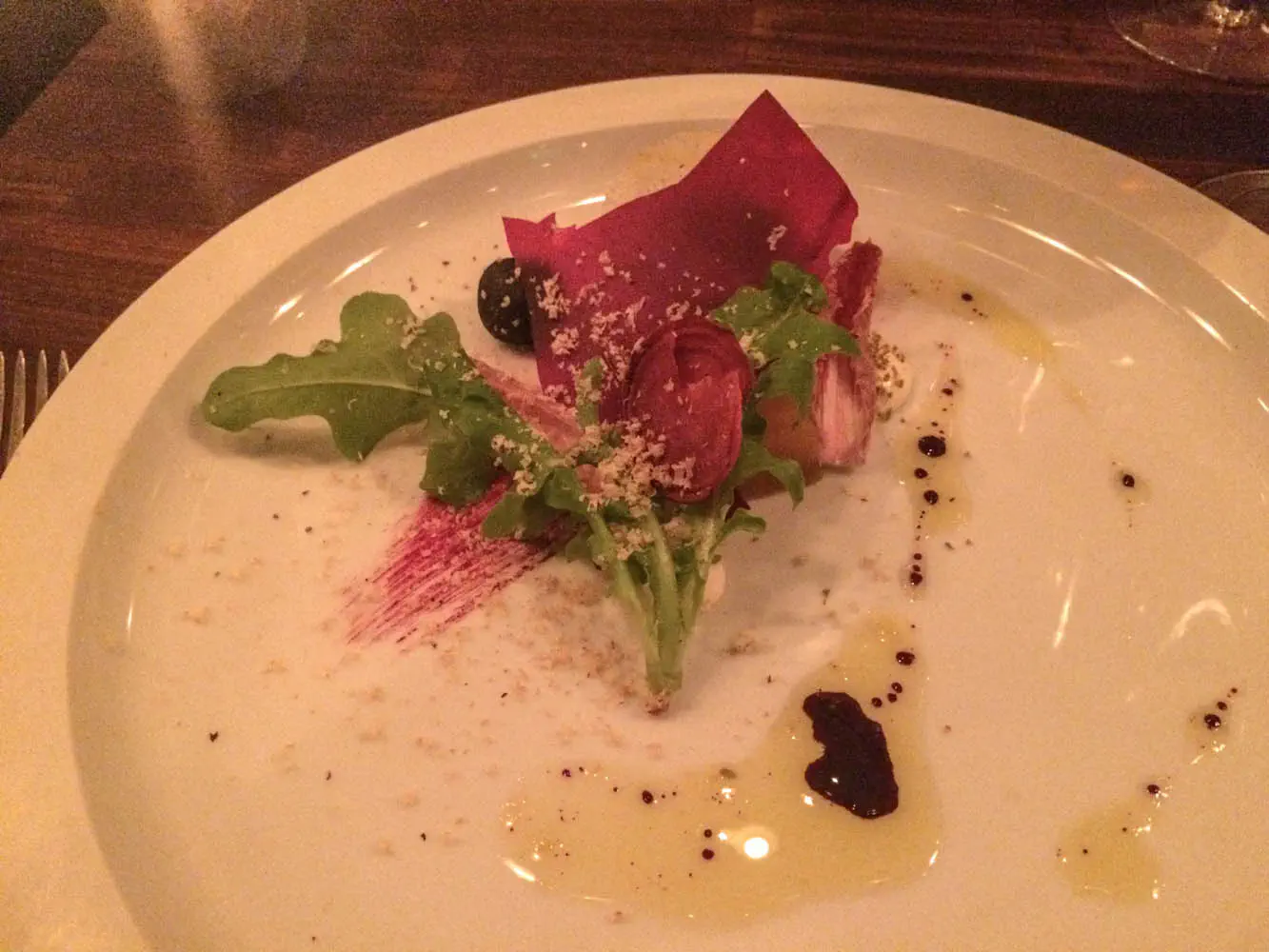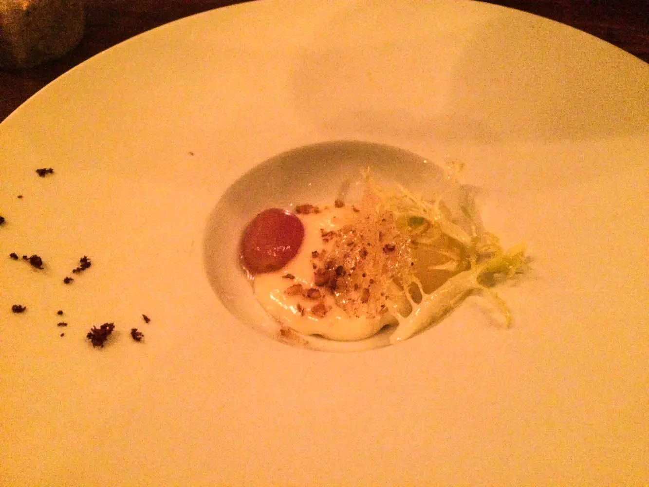 2. Pear & Beetroot with goat curd, hay ash, and hazelnut. This is the first “salad” of the night. The top red thing was a beet chip. There are various hints of pears in the oils. If you love beets, this was also good too.