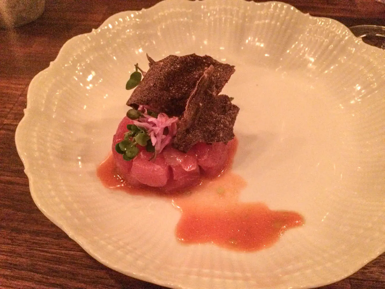 4. Tuna Crudo with kim chi, forbidden rice, and seaweed. At the top of this tuna “tartare” kind of thing sat some chips. I think they used some of the pear juice to mix with the sauce that they poured on top of it. The tuna was super soft and good. The sauce was also a perfect blend to this.
