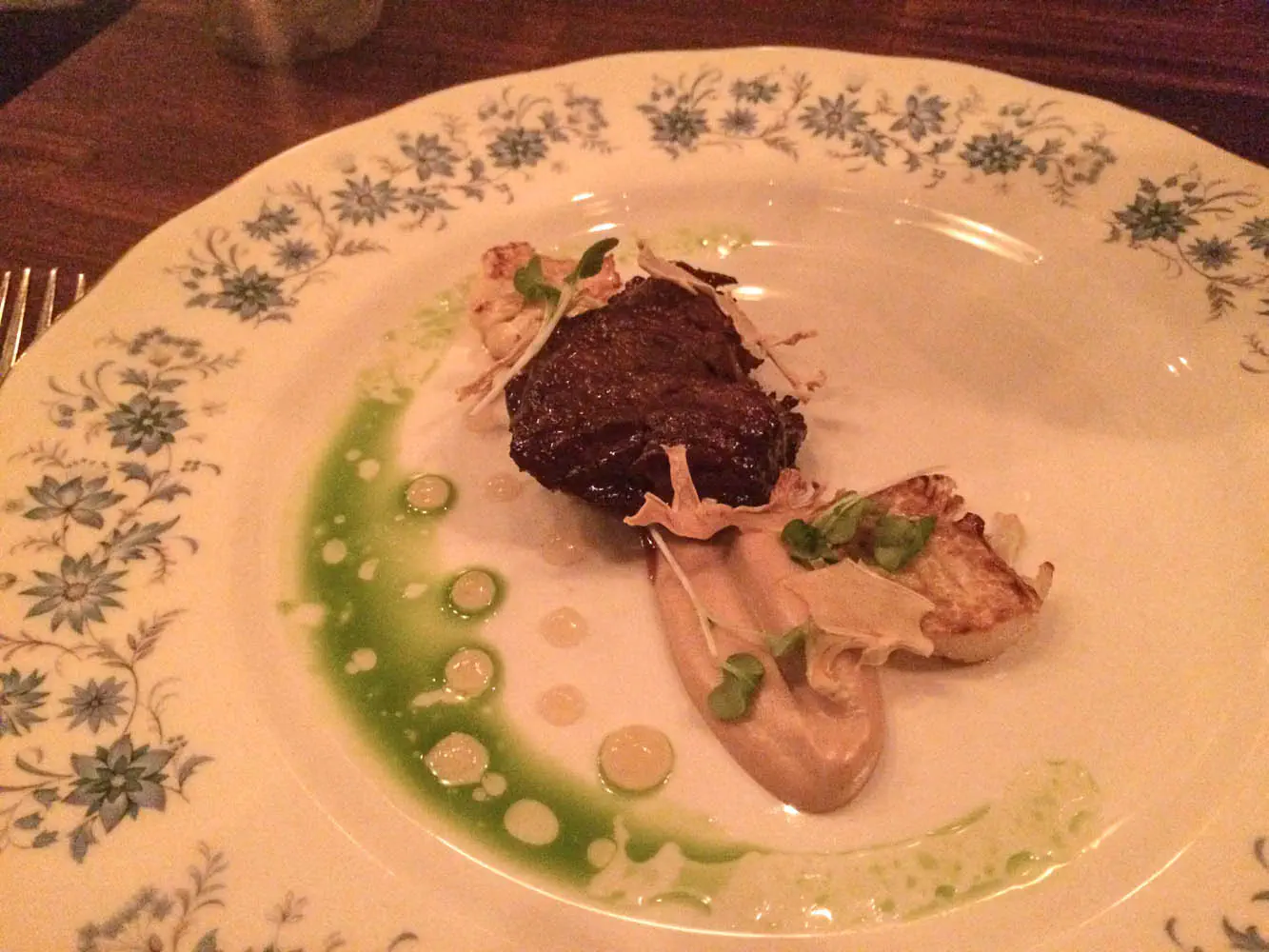 7. Veal Cheek with cauliflower, pear gel, and parsley oil. The veal cheek was very tender. You don’t even need the knife that they give you. The oil had some pear flavors in it in addition to the pear gel. This is one of those dishes that after you try it, it leaves a smile in your head.