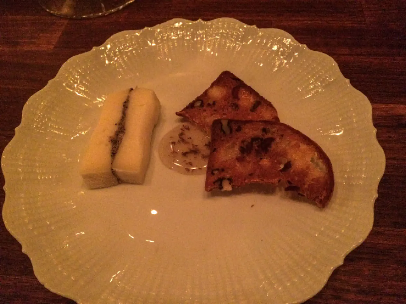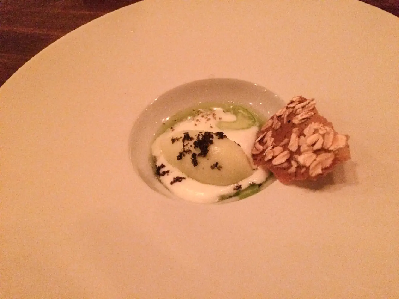 11. Cheese. This was the cheese course. In the middle, there was some oil with truffle in it. The cheese has some truffle spread in the middle. The cheese reminded me of very soft mozzarella texturally.
