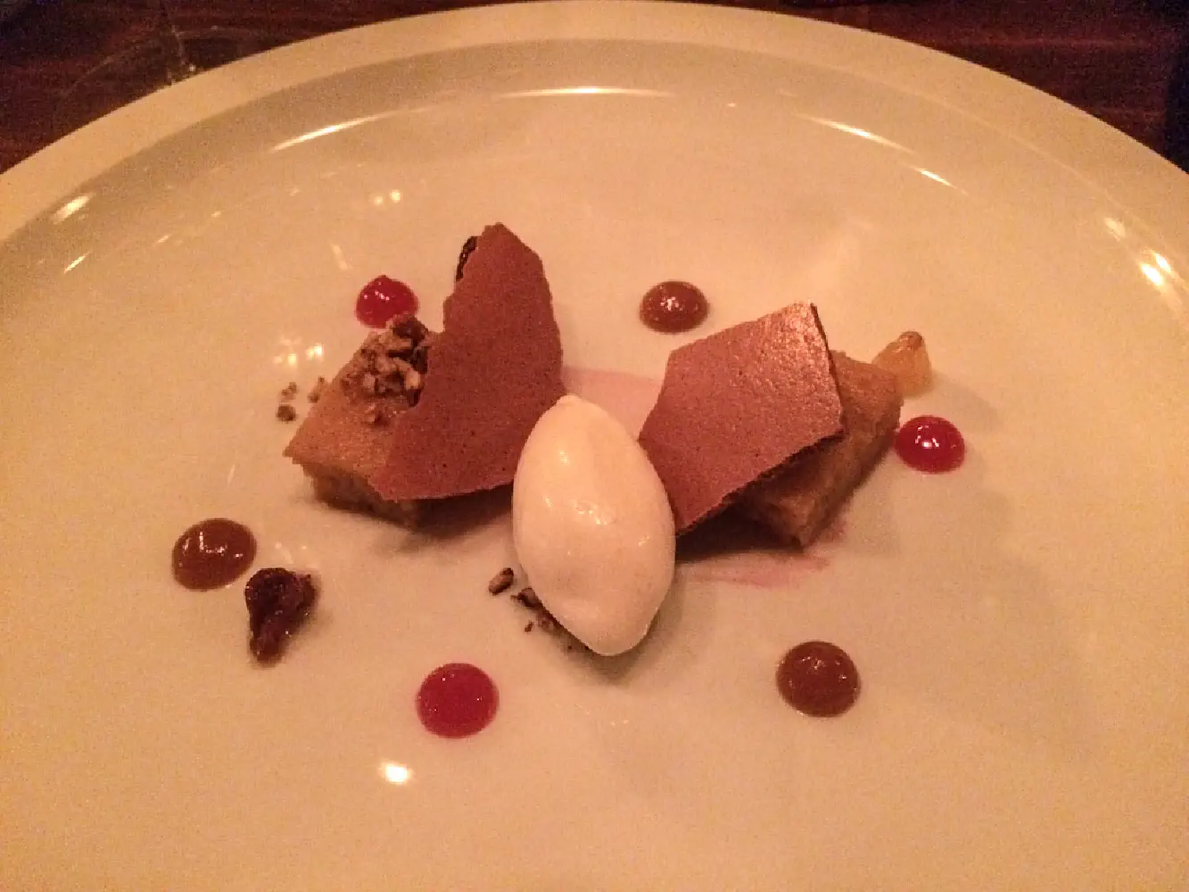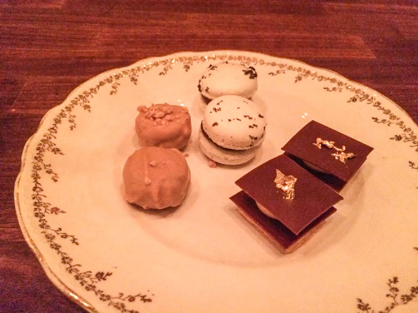 14. Dessert trio. The left is some type of candy with truffle filling. The right is chocolate with some truffle stuff in the middle. The macarons have been laced with black truffles. The truffle filling candy was amazing. In the center is liquid truffle ooze that literally just seeps out once you bite into it (think molten lava cakes but instead of chocolate there is truffle cream in the middle). The chocolate truffle candy was pretty good, but it wasn’t too memorable. The black truffle macarons were interested in that it left some interesting after tastes.