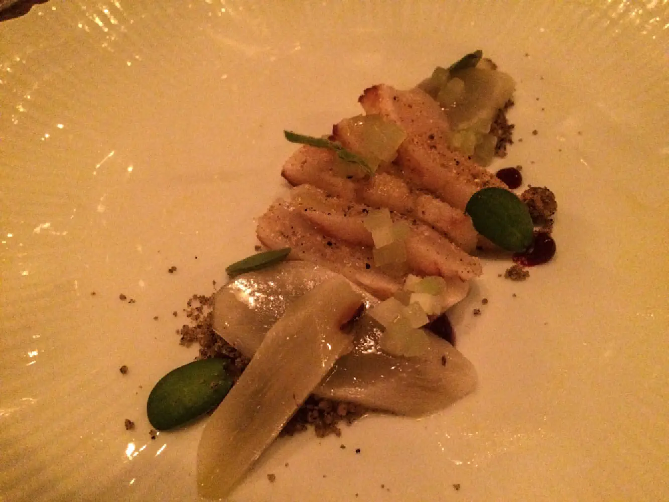 4. Scallop Crudo with truffle soil, beets, and salsify. This was an interesting dish in that the scallop was laying on top of a medley of fake “soil”. The scallop was raw but very tender and crisp as expected. I loved the truffle soil with the scallop because it gave it some complexity in flavor.