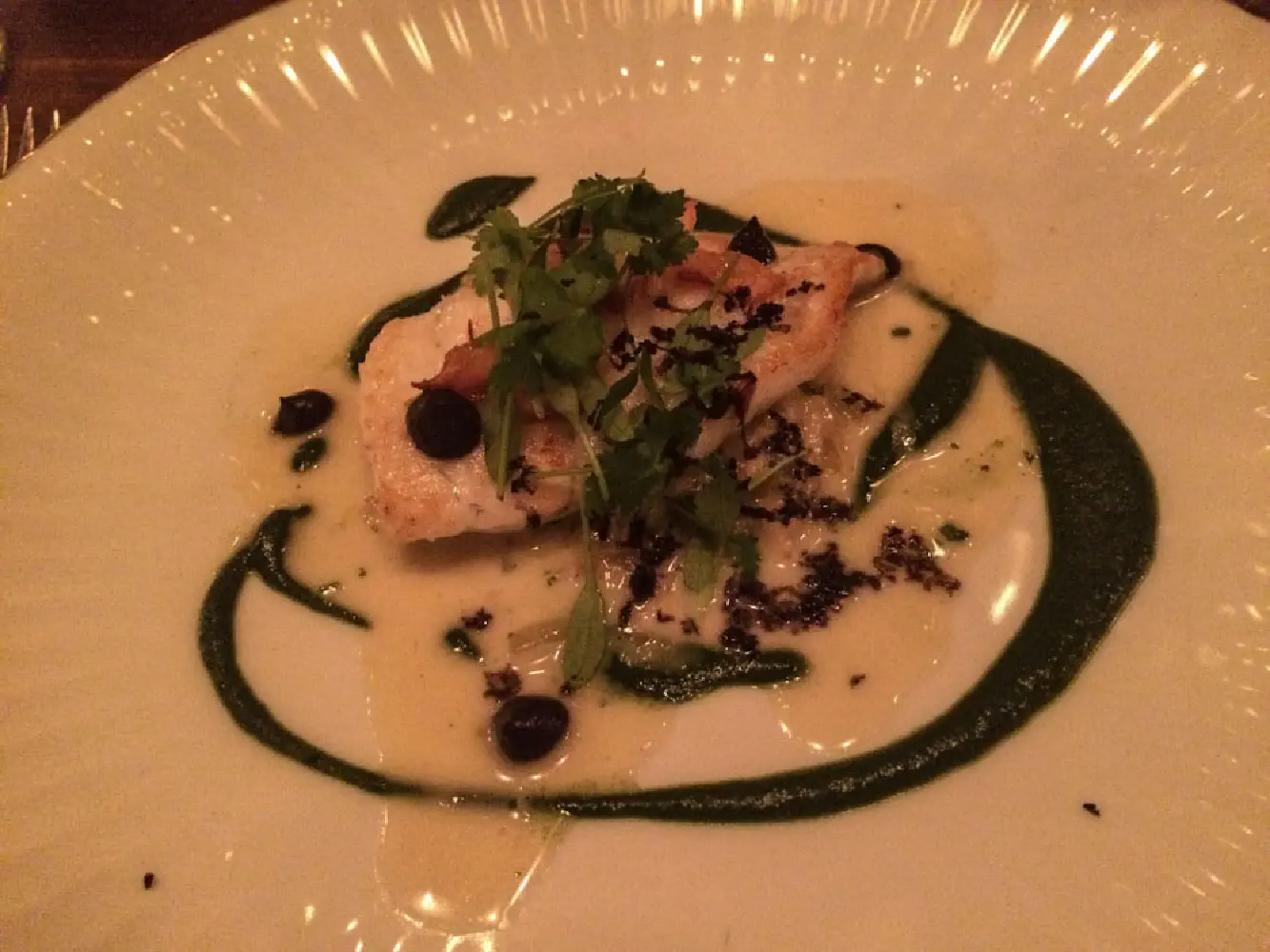 6. Turbot with endive, spinach, and truffle coulis. The turbot, which is a flat fish, was cooked nicely with minimal flavors. Combined with the truffle coulis and the rest of the ingredients, it created additional depths of flavor.