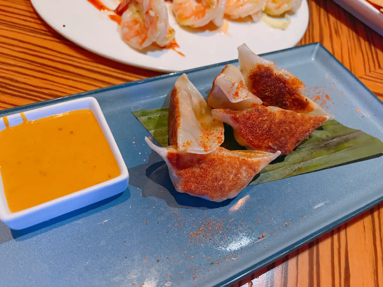 The decor and lighting of this reminds me a lot of the Miami nightclub scene with booths, bright orange chairs, lots of chandeliers, and a dark ambiance with blue lights everywhere. It was quite noisy inside as well. The table we sat at had 2 chairs that protruded out into the paths of the servers, so it was a little uncomfortable that the servers had to snake their way behind these chairs to get by. In addition, there were a lot of large parties dining as well. By no means did it feel claustrophobic, but it was quite a different experience than other Disney World resort restaurants where tables were more spread out.