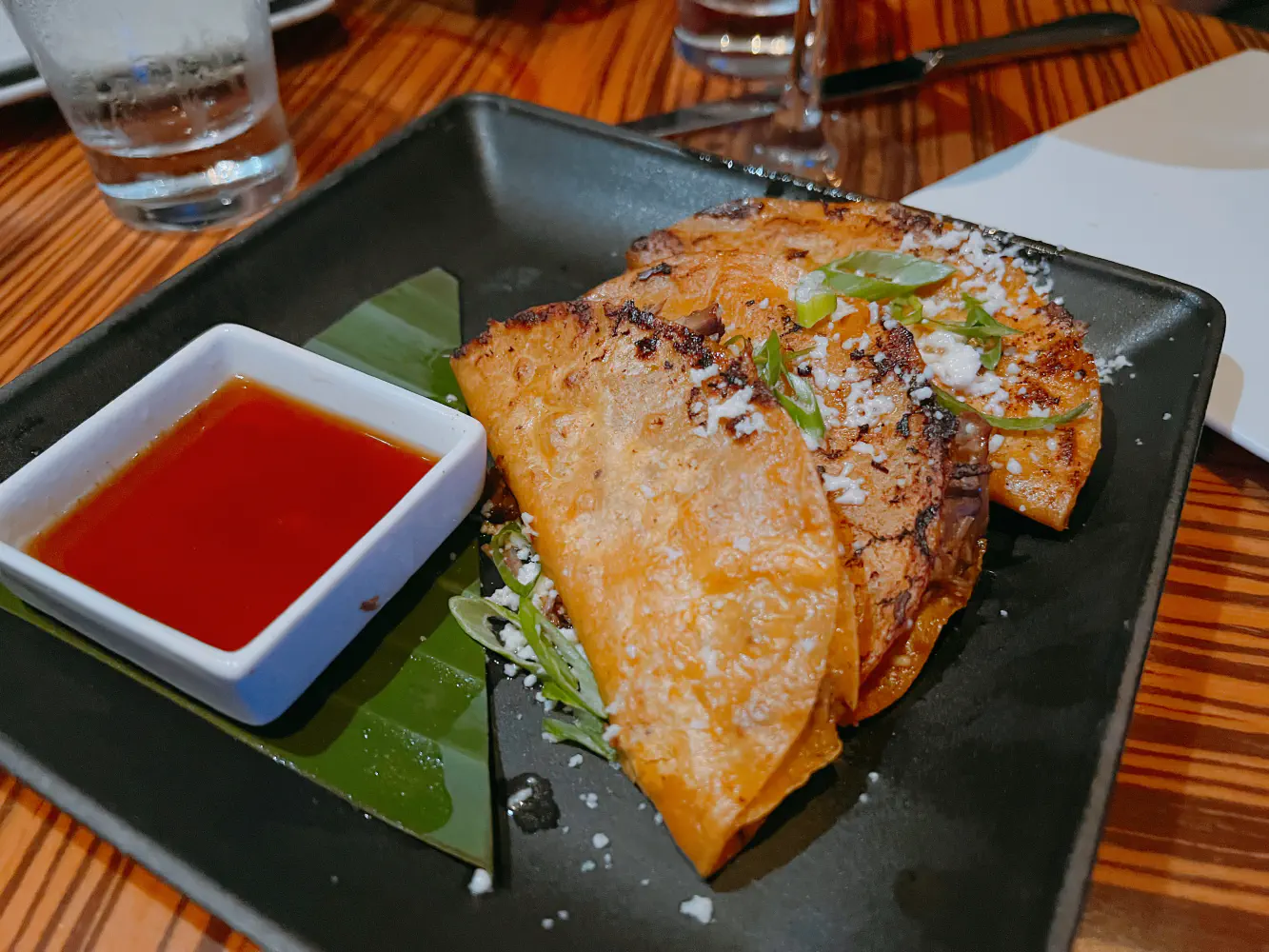 The Peking duck birria tacos ($23) came with slow cooked Chinese duck, white corn tortillas, queso fresco, chili oil, and hoisin dippin jus. These are probably similar to the typical fried birria style tacos. The duck meat was good though I thought it was just basically normal roast duck. I was expecting some stronger Peking duck flavors to come out. The overall concept of this was a little disappointing because it was like a more refined version of Jack in the Box tacos. The fried shell gave it the crispy texture, but the duck was completely drenched and overpowered by the queso fresco. The hoisin dippin jus basically overpowered everything. I think there were too many strong components to this, such that you could have substituted the duck with any meat, and it would’ve tasted the same.