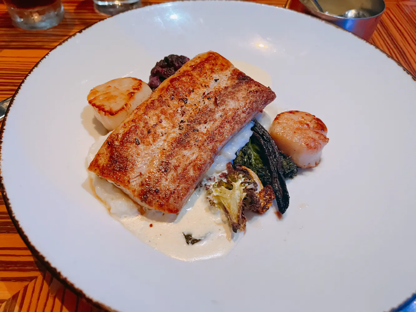 The Bluezoo Simply Fish ($37) entree was ordered with mahi mahi, white wine sauce, creamy risotto, seasonal vegetables, and 2 scallops (+$18). This was cooked and seasoned nicely. The mahi mahi was meaty and fresh. The white wine sauce was actually very light, and it could have used more thickening to bring out the wine flavors. The scallops were good but very disappointing for their sizes. My partner added one scallop, and the size of that one was nearly equal to the two of mine. All in all for the price, I thought it was pretty good compared to other places we’ve been at.