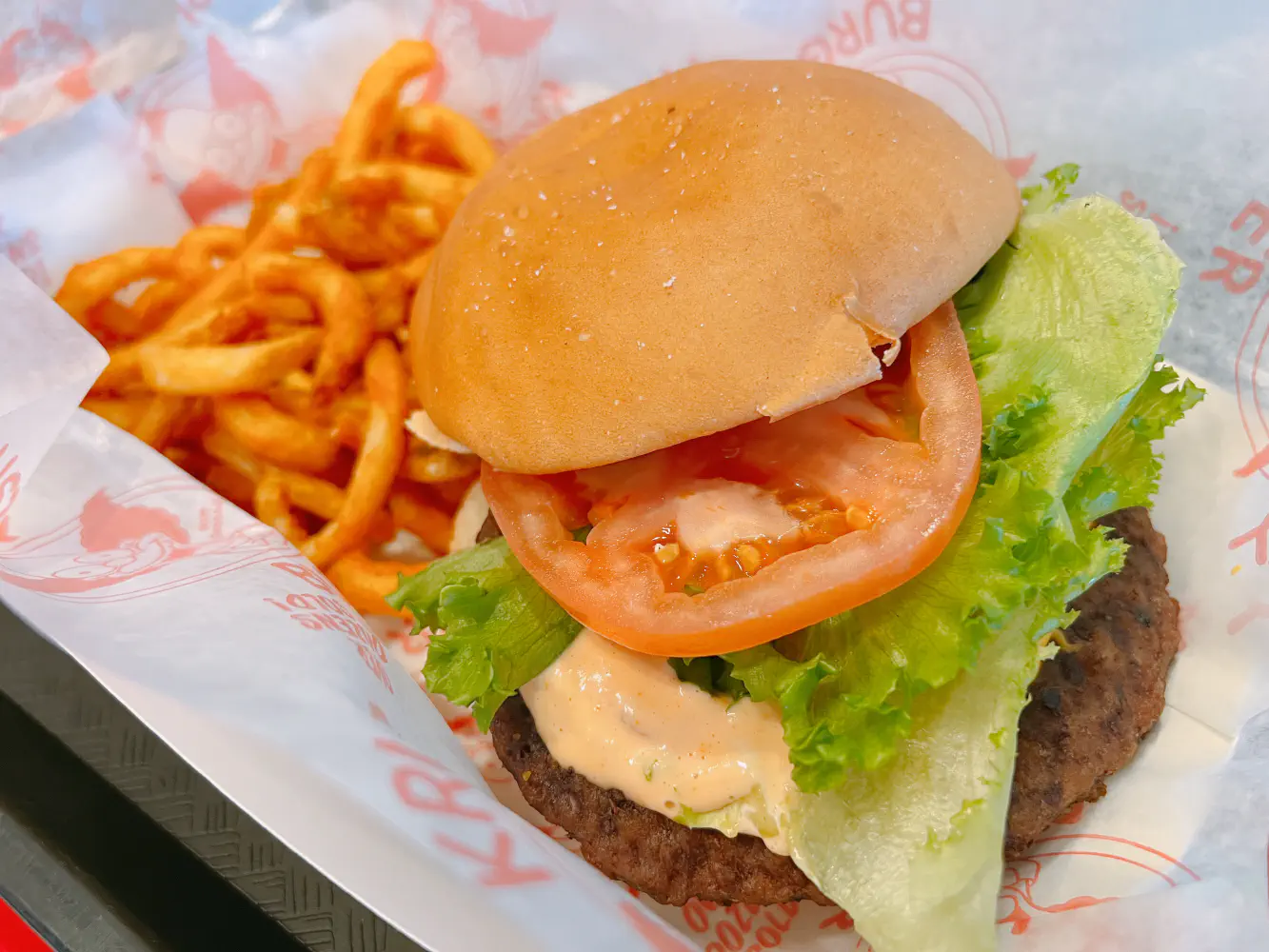 The Krusty Burger Combo ($15.99) came with a 1/3 lb. burger with secret sauce, cheddar cheese sauce, giant tomato slice, iceberg lettuce, on a specialty bun. It also came with Kurly fries and a Buzz cola. The bun is very large and doesn’t have that airy fluff that I was hoping for. The burger itself was the epitome of mediocre and a little worse than even some mall burgers that I’ve had. The meat was fairly dry, and the sauces didn’t really help all that much. The secret sauce reminded me of a ketchup and 1000 island mixture. The Kurly fries was just curly fries, and the Buzz cola actually was lots of cherry syrup with soda.