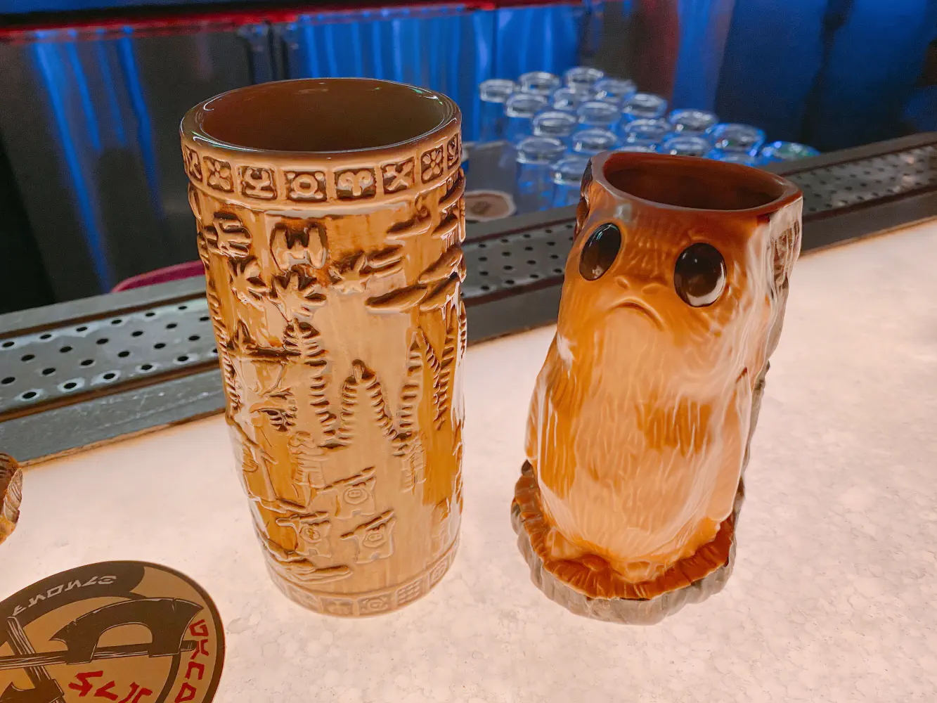 The costs of the souvenir cups are $35 for the porg and $45 for the Endor. If you want to swap the cocktail for any of the two, you can add $10.