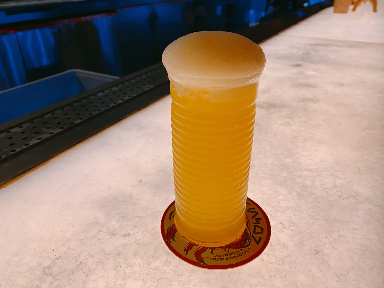 In the cantina, we got the Yub Nub and the Cliff Dweller cup substituted with the Jedi Mind Trick. The Yub Nub was served in a Battle of Endor mug and comes with Malibu Pineapple rum, Sailor Jerry Spiced Rum, citrus juices, and passion fruit. Keep in mind that many of these drinks are mostly pre-mixed, so there’s very little for the bartenders to do other than pour some stuff. This drink was quite delicious in that it was kind of like a pineapple fruity resort cocktail. The alcohol was tasteless, so that actually made it quite dangerous. The bartender mentioned to us that we could buy the souvenir porg cup from the Cliff Dweller drink and for $10 more we can substitute a different drink.