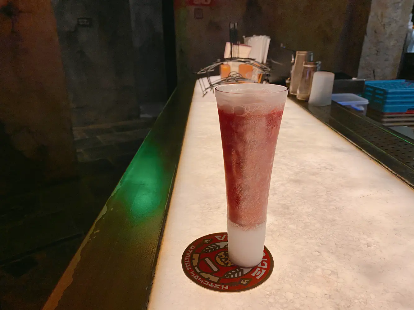 The Fuzzy Tauntaun came with Cîroc Peach vodka, Bols Peach Schnapps, Simply Orange with tangerine, pure cane sugar, and “Buzz Button Tingling” foam. Many people recommend to get this drink because of it’s uniqueness where the foam makes you lips numb or tingling. In actuality, this tingle is very similar to the feeling when you taste sichuan peppercorns. My partner didn’t really enjoy the sensation, and I thought it was a little gimmicky. The drink itself was pretty decent with some screwdriver aftertones. I definitely would recommend that this is not a “must get” if you have ever had sichuan peppercorns hit your tongue before.