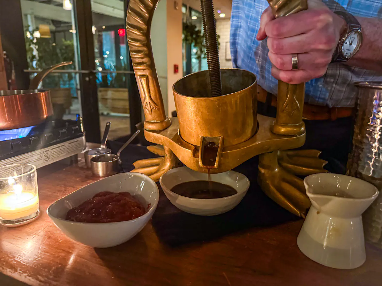 Part of the course or dish is to show a demo of the actual duck press action. What they do is stuff all the guts (e.g., liver, heart, anything squishy) and neck, and they turn the press down until all the juices come out. As it comes out, they capture the juices into a small sauce bowl. They fire up a pan and throw in a bunch of seasoning including this very irony sauce mixture. They also add into it some guava paste to give it a nice sweetness.