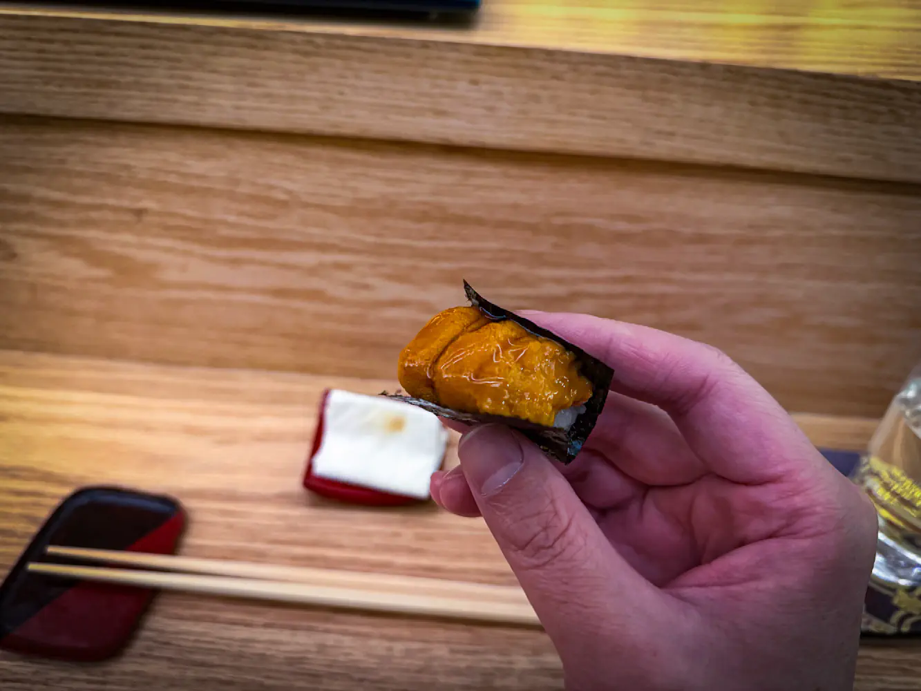 The Hokkaido uni sushi came on this brownish rice. The uni was amazingly divine, and we were sad that it was served so little! The uni was so sweet, creamy, and full of umami. Whatever box they pulled this from must have added an extra 100% to its flavor profile because it’s simply one of the best I’ve had in a very long time.
