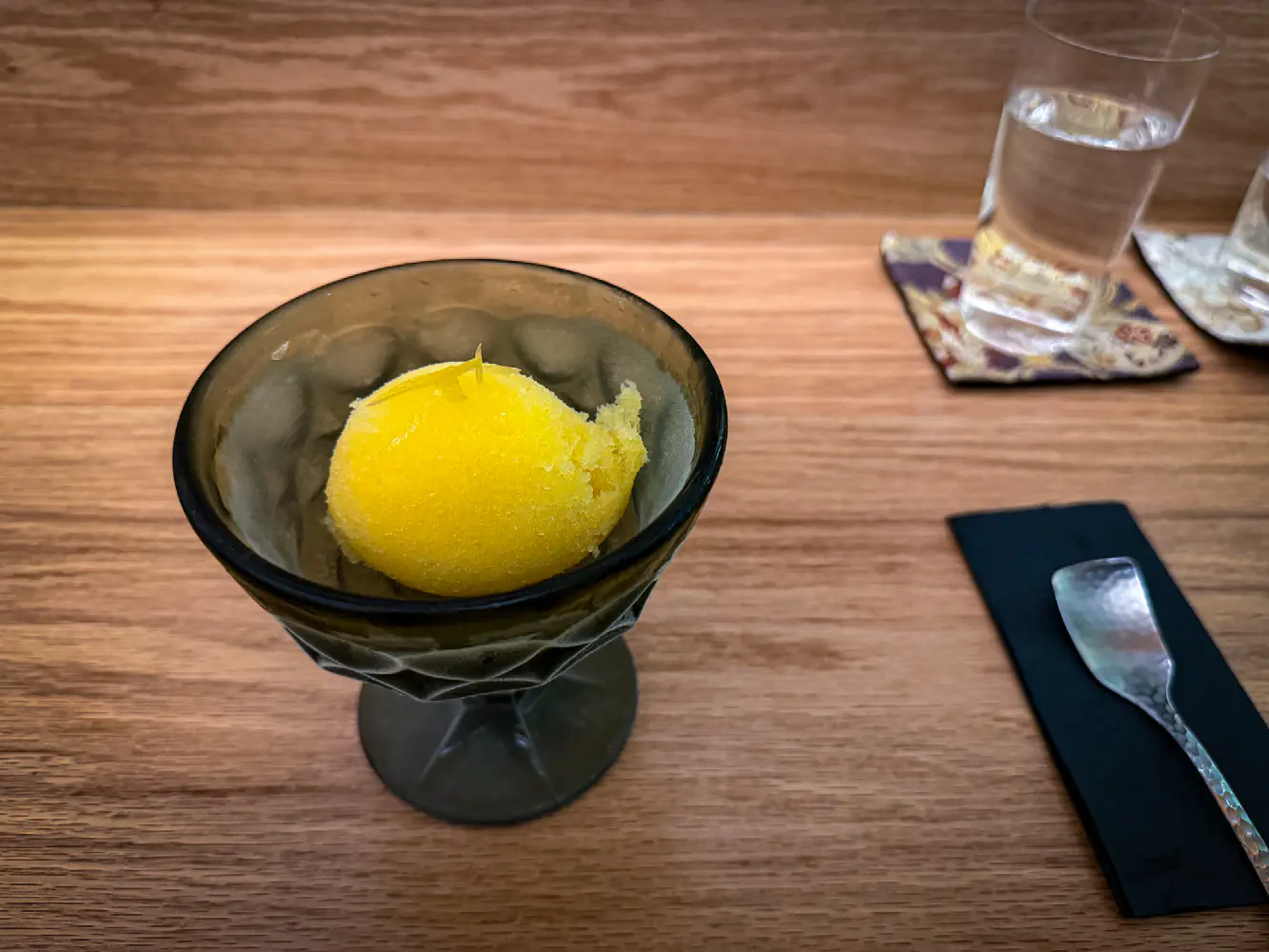 The Dessert was an orange and ginger sorbet, topped with candied ginger. This was definitely the final course of the night, which offered a very nice ending to our omakase.